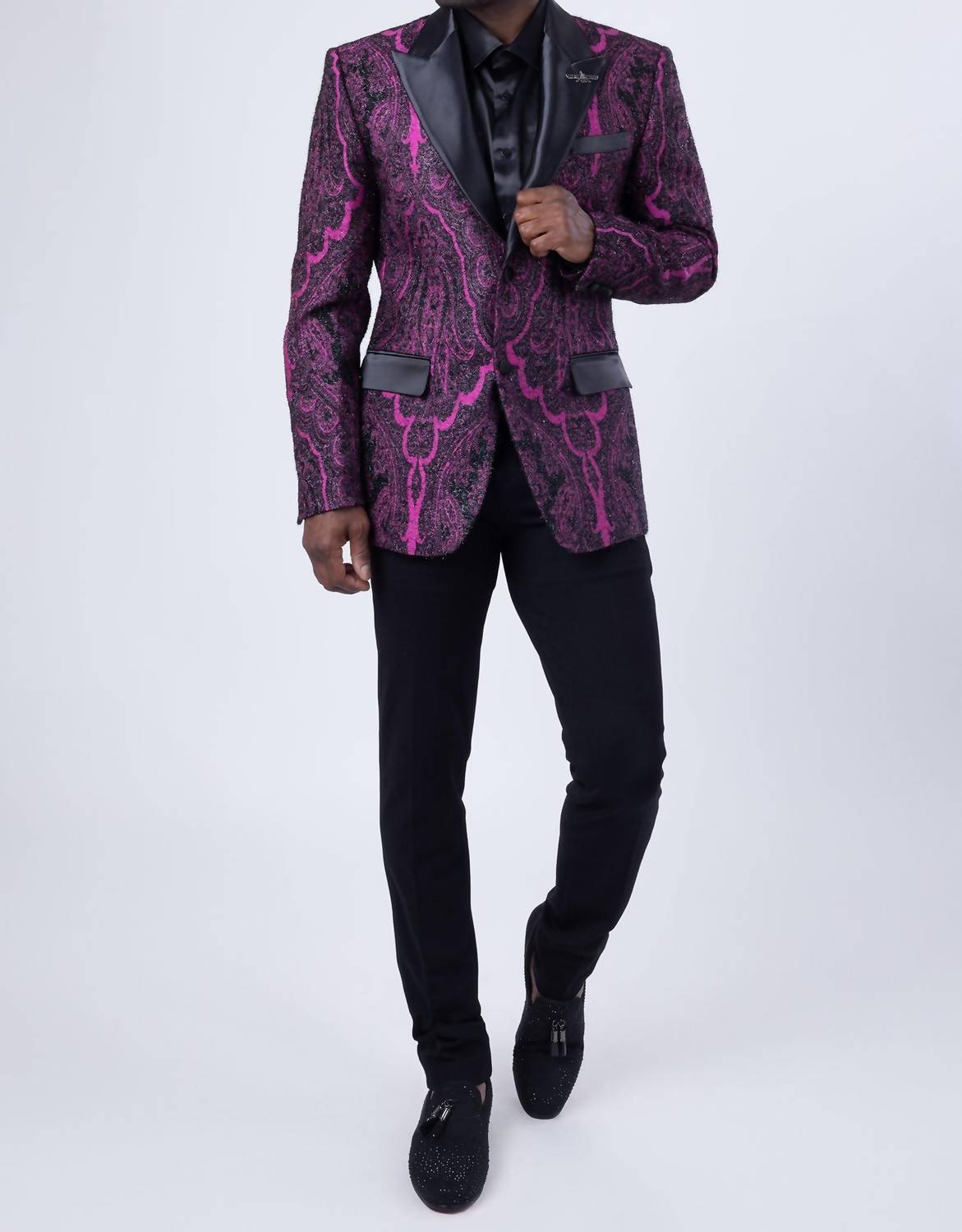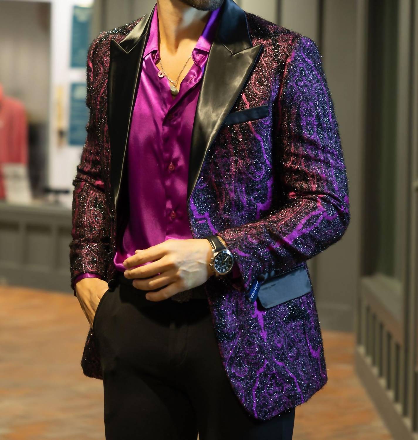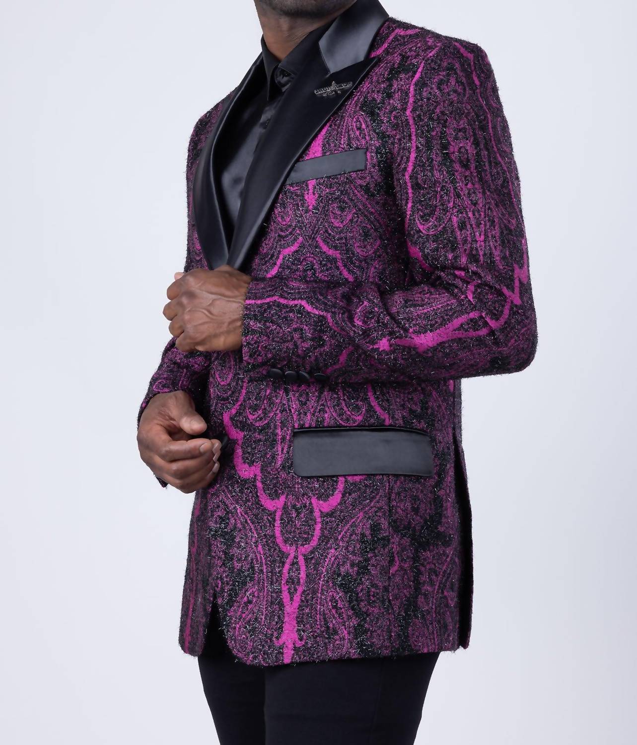 Elevate your wardrobe with the Viterbo Ton Blazer from Barabas, featuring long sleeves and a sophisticated wool Fleur-de-lis design that exudes confidence. The blazer boasts a slim fit with a regular length, adorned with a satin peak lapel collar crafted from 69% Regenerated Fiber, 29% Rayon, and 2% Spandex. It offers a practical two-button closure and comes with front welt chest and hip pockets, as well as an interior pocket for added convenience. Designed for versatility, this patterned piece is ideal for both formal and casual occasions. Dry clean only.