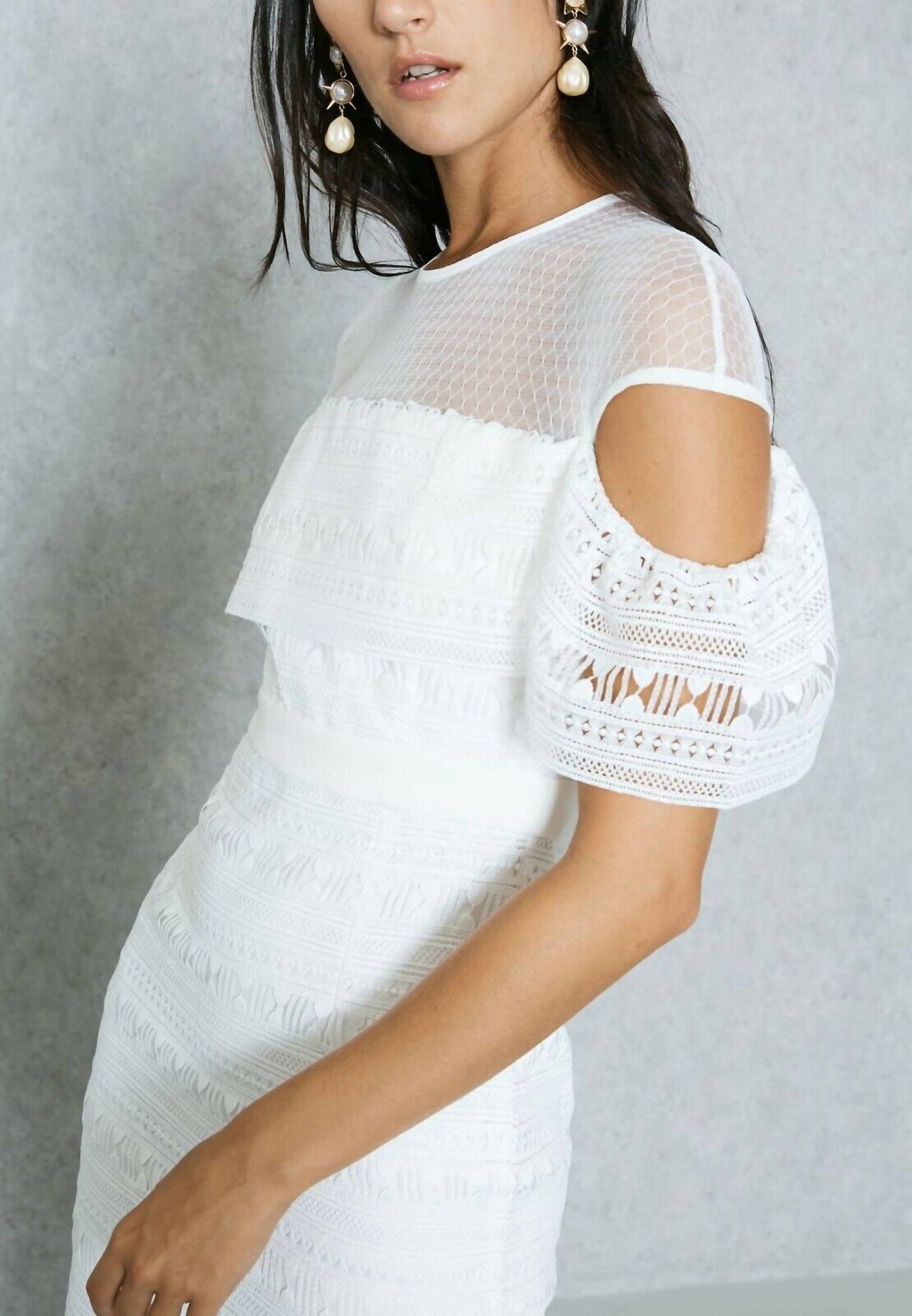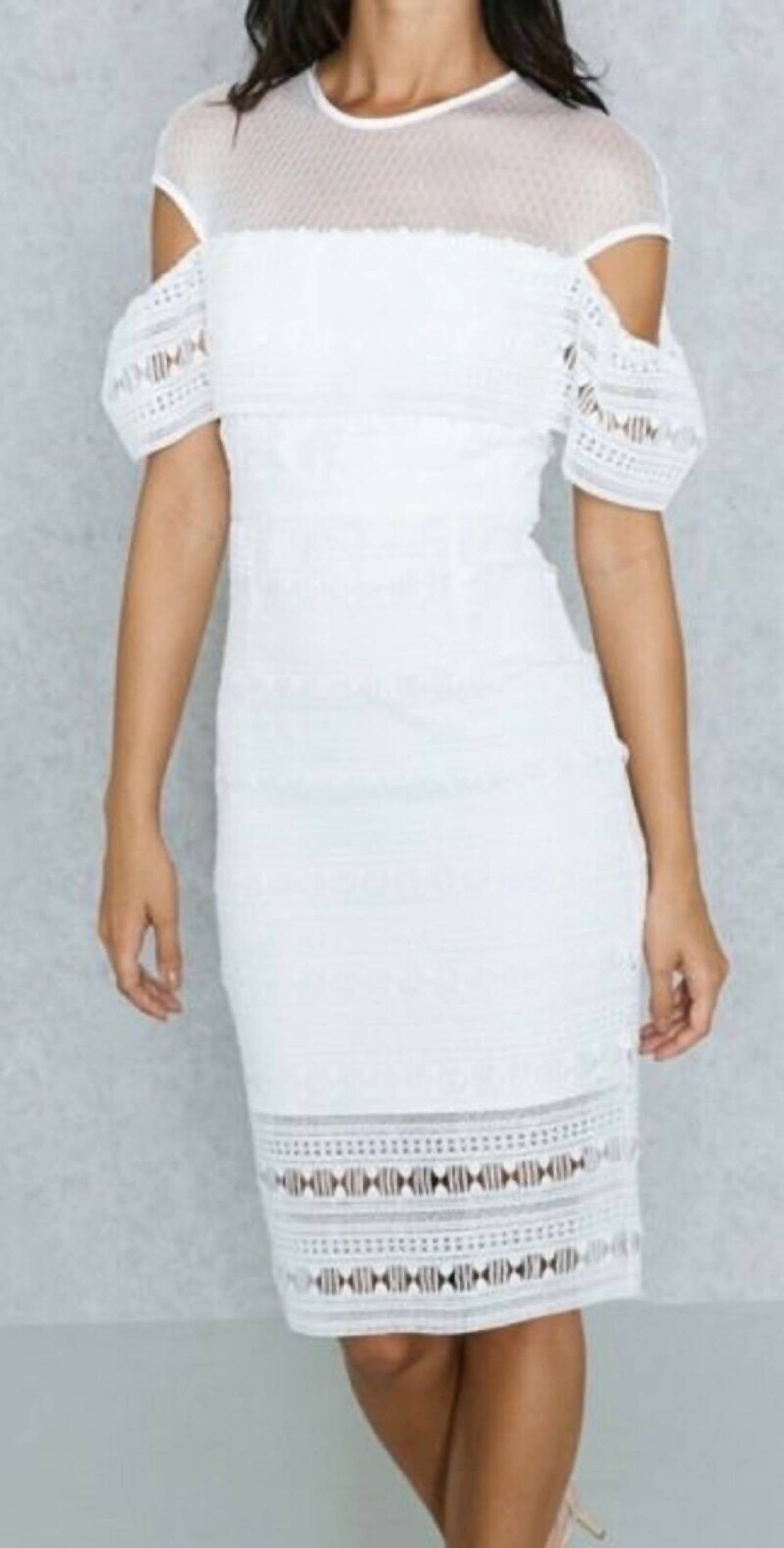 A short and breezy dress for those warmer days. Introducing the Embroidery Lace Cut Out Ruffle Sleeve Cocktail Dress by BARDOT, a feminine and sophisticated choice for any event. This white midi sheath dress highlights a soft and comfortable pure polyester lace fabric with intricate embroidery and a chic see-through mesh panel insert at the top. Featuring a round neck and stylish cold shoulder sleeves, the dress provides a flattering bodycon fit. The length is meticulously tailored at 40" with shoulder dimensions of 19", chest 16.5", waist 14", hips 18", and sleeves 5.25", complete with a concealed zipper back placket for easy wear.