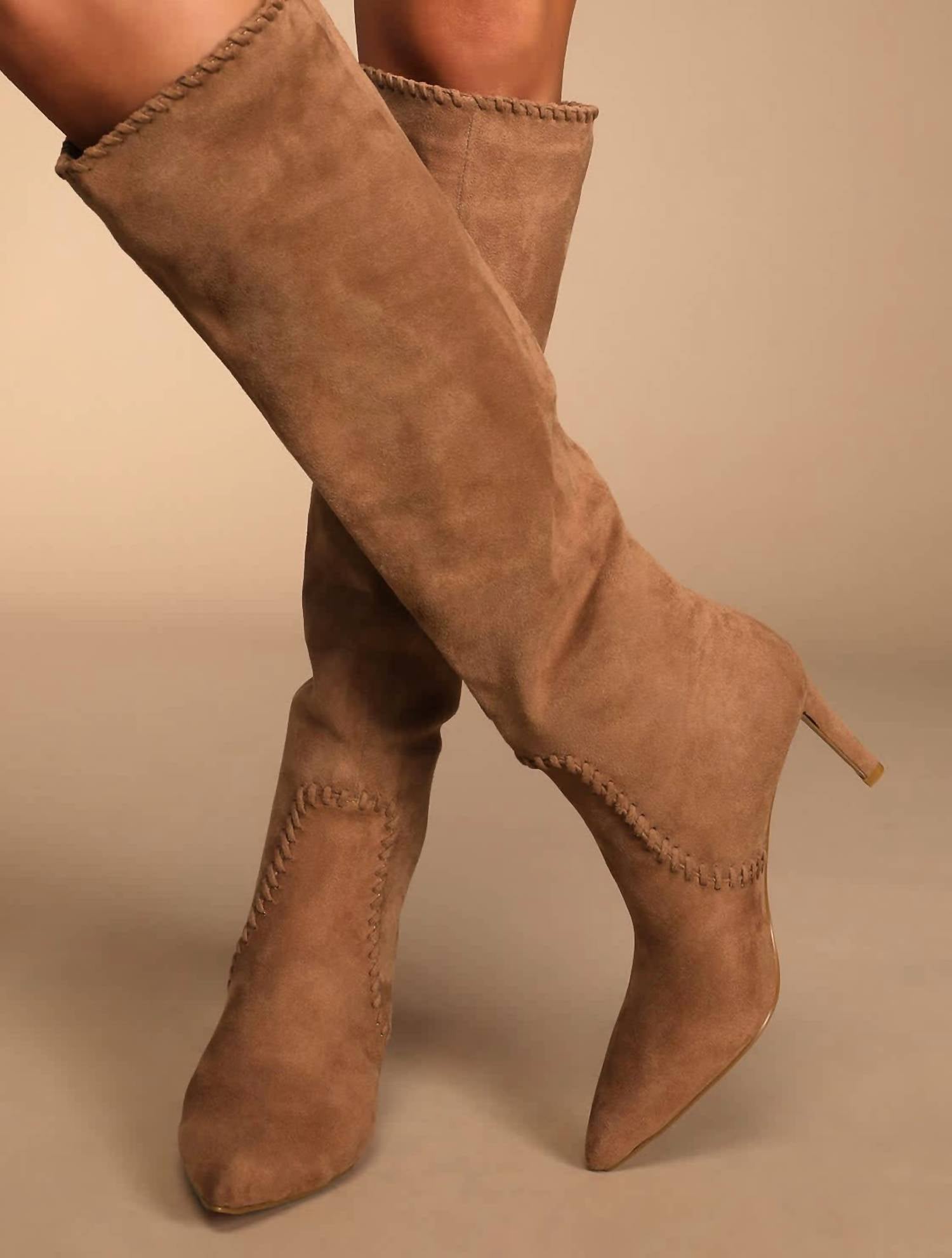 These over the knee boots are equal parts classic and cool. Step up your style with the Brielle Suede Knee-high Slip-on Boots by Billini, perfect for fall evening events. Featuring a sophisticated pointed toe and a high 3.75" spool heel. Crafted from faux suede, these women's knee-high boots promise both style and comfort with a cushioned insole and nonskid rubber sole. These minimalist boots emphasize elegance and are imported.
