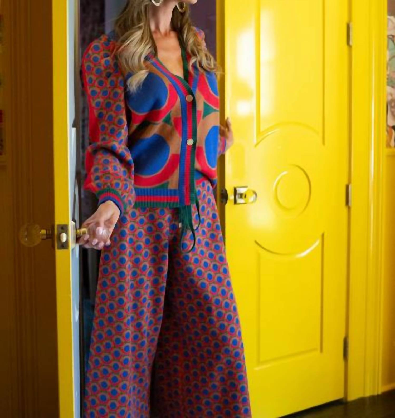 Wear this v-neck sweater with your favorite denim for the perfect fall look. The Clara Cardigan in Mod features a signature gold button front closure, subtle blouson sleeves, and a slightly tailored fit for a polished yet playful silhouette. The bold mod print, inspired by vintage Italian style, brings a vibrant retro touch that makes a statement. Pair it with the matching Teddy Crop Trouser for a cozy, coordinated set that’s equal parts chic and comfortable. Details: Signature gold logo buttons Blouson sleeves Slightly tailored fit