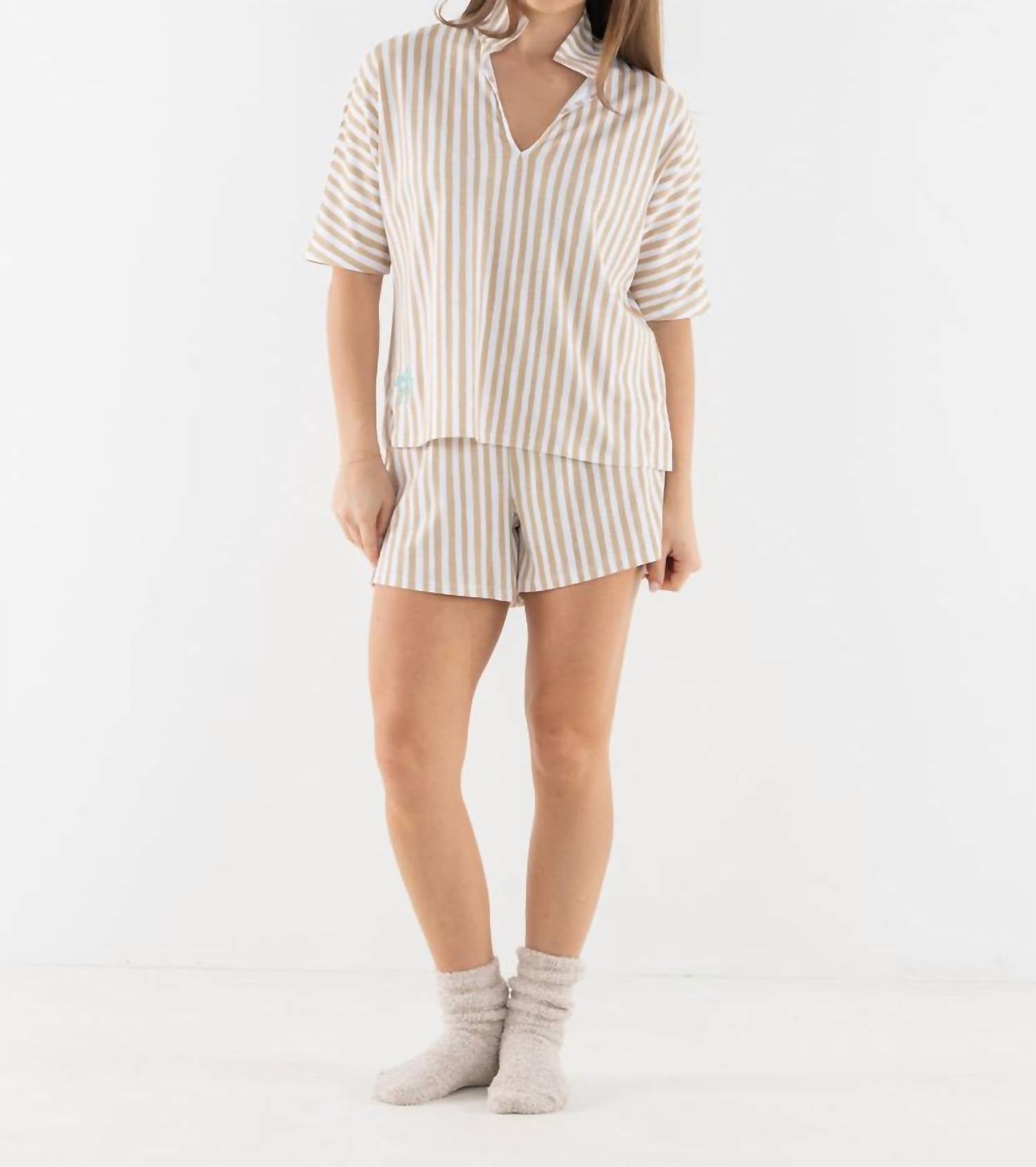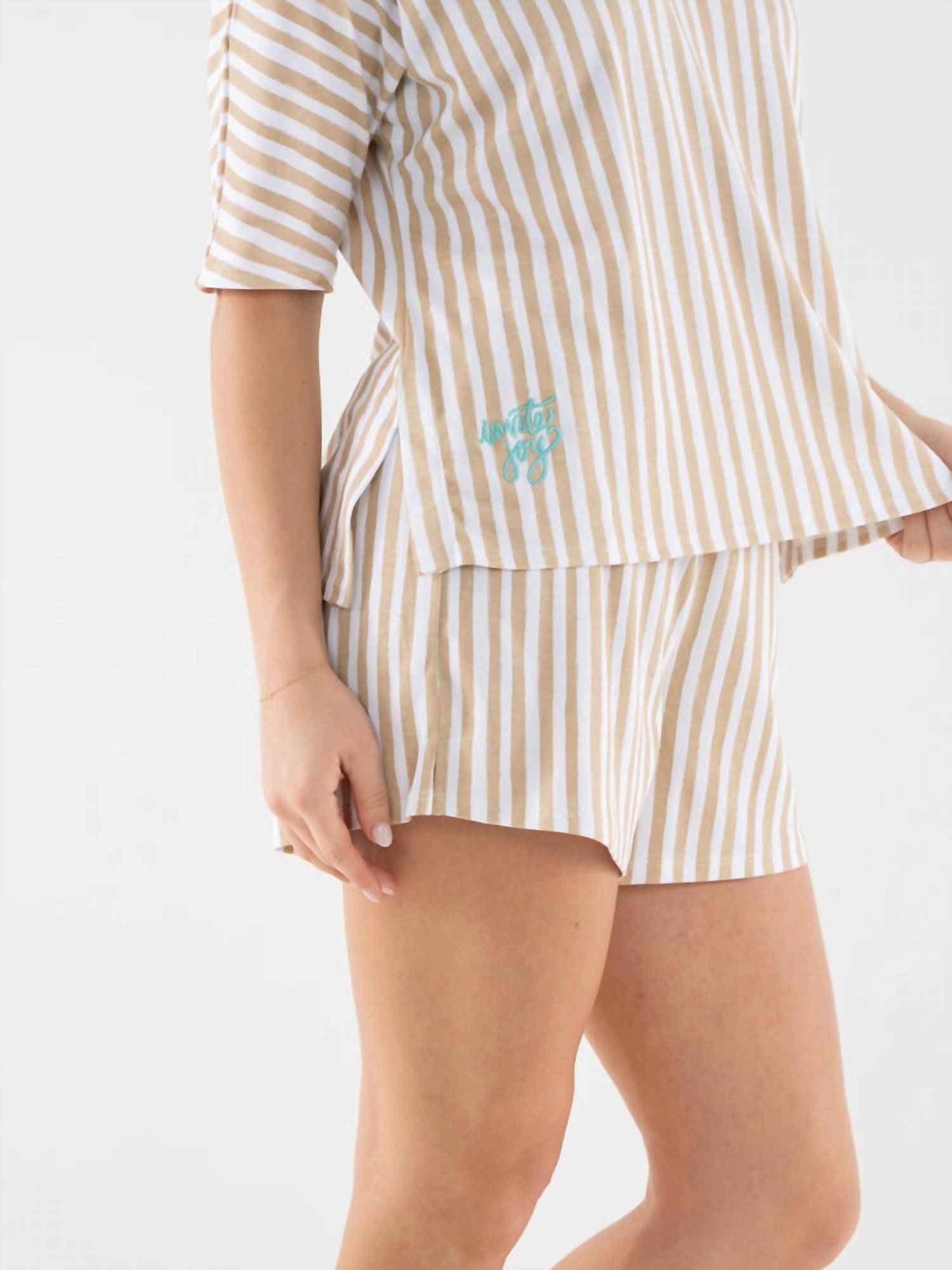 The perfect piece to lounge in, sleep in, and cook breakfast in. Experience ultimate comfort with the Stripe Pajama Short Set by Emily McCarthy, crafted for the discerning woman who appreciates style and ease. These pajamas feature a trendy Y2K vibe in a delightful mist green stripe pattern, complemented by short sleeves and a classic crewneck for a relaxed fit. They are perfect for a Fall holiday party, incorporating a festive touch for St. Patrick's Day. Easy to care for, simply machine wash and tumble dry for effortless maintenance.