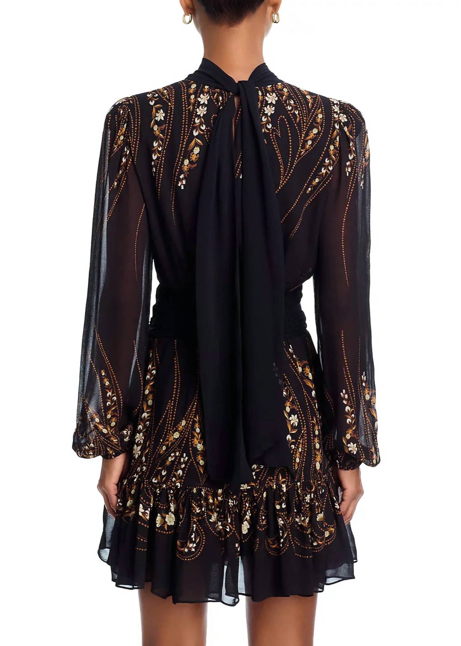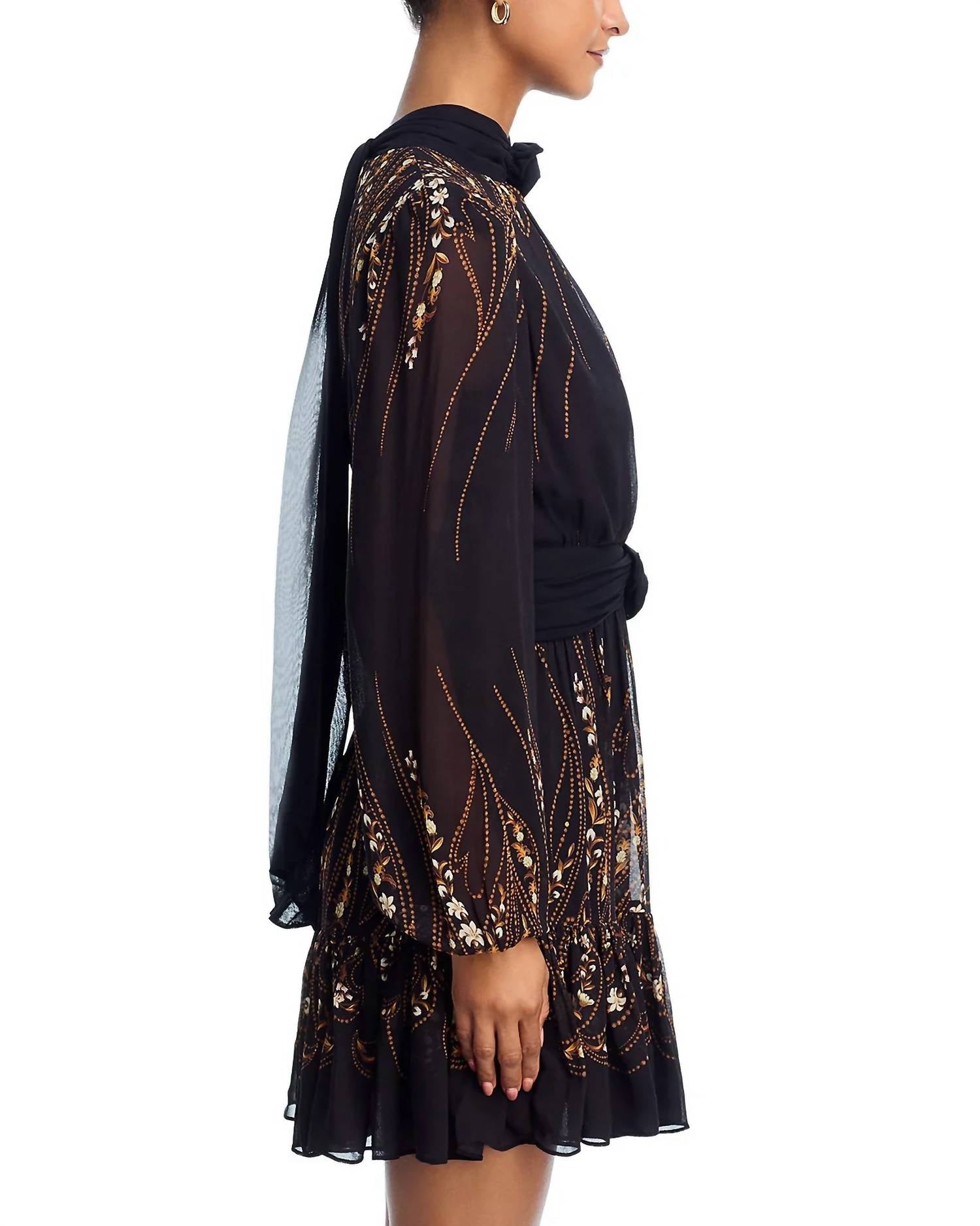 A short and breezy dress for those warmer days. Enhance your evening wardrobe with the Garden Silhouette Long Sleeve Mini Dress by FARM RIO, embodying quiet luxury with its elegant stripe pattern. This stylish black dress features a mockneck with rosette trim, a keyhole detail, and a tie closure at the neck back for a sophisticated touch. Crafted from 100% Viscose, it offers a flattering fit and flare silhouette with long sleeves, rosette detail at the front waist, and a tiered hem. Effortlessly perfect for spring evening events, the dress is smocked at the back waist for added comfort.