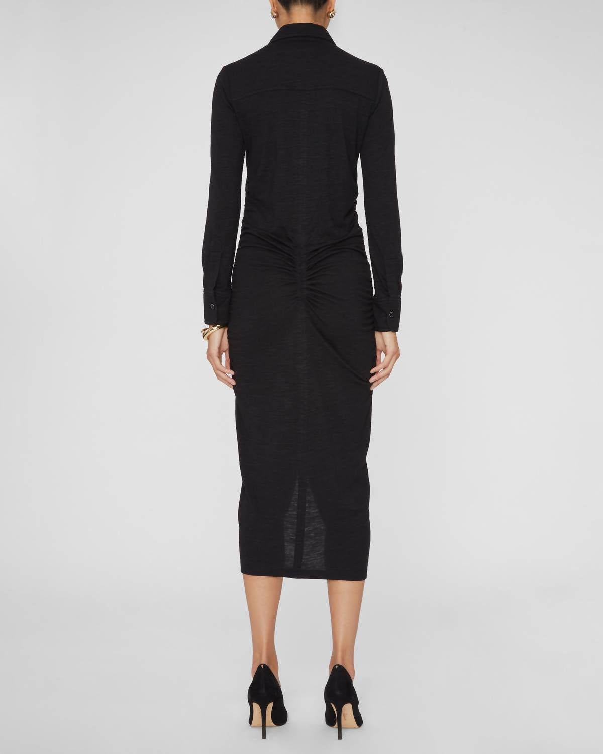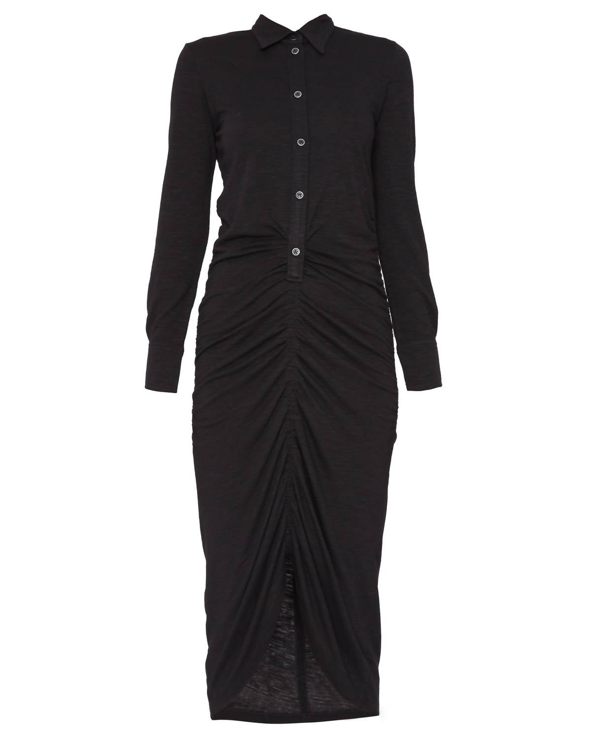 A flattering yet comfortable dress you'll be reaching for season after season. Introducing the Ivalia Long Sleeve Dress by ISABEL MARANT, a sophisticated choice for your next dinner party. This elegant black bodycon dress features long sleeves with buttoned cuffs and a point collar. Crafted from a blend of 50% polyamide, 30% linen, and 20% virgin wool, it showcases ruched detailing at the front and back. Designed in a midi length and finished with a half-front button placket for easy wear, it requires dry cleaning to maintain its pristine look. Ideal for fall occasions, this solid-patterned piece epitomizes preppy chic.