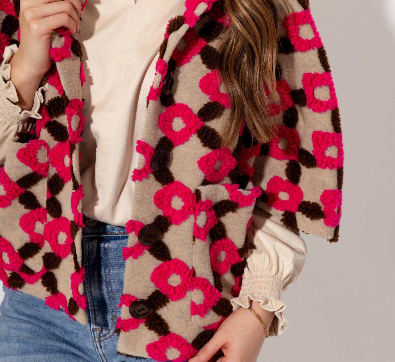 Throw on this amazing cape for extra warmth and style during the cooler seasons. Presenting the Ivy Jane Pop Flower Capelet, an elegant addition to any ensemble. With its striking brown and pink floral design on a cream backdrop, this piece features a stylish three-quarter sleeve length and a classic collar. Closure is facilitated by buttons, offering a snug fit. A must-have for the spring season, this capelet effortlessly combines minimalist design with an artistic flair.