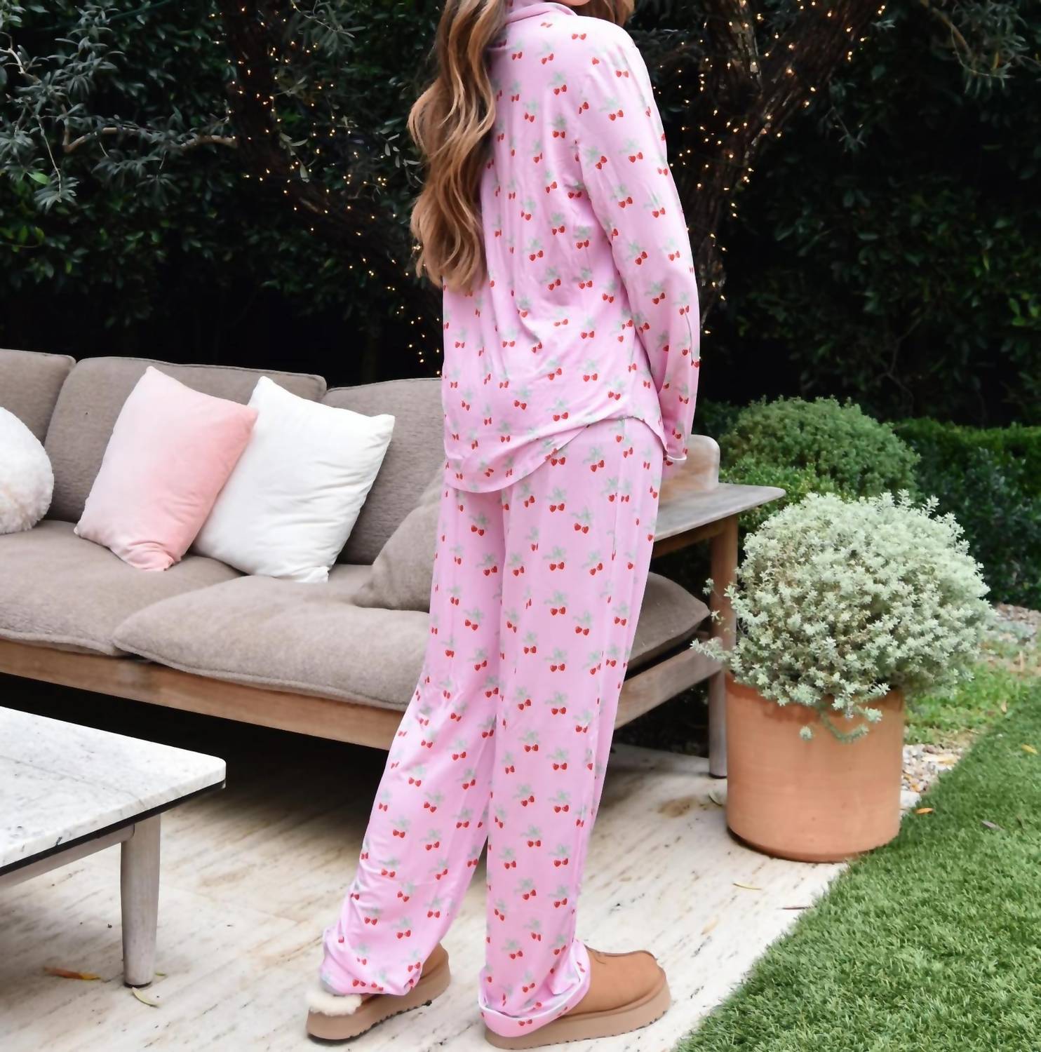 Elevate your cozy nights with the Juniors Maia Bow PJ Pant Set by Katie J NYC in a vibrant cherry hue. This chic pajama set features a long sleeve top with contrasting trim and a button front, paired with pants that have an elastic waist and drawstring for ultimate comfort. Composed of 95% Viscose from Bamboo and 5% Spandex, this set offers a tagless design with temperature cooling benefits. Care: Machine wash and tumble dry. Available in junior sizes XXS to XL.