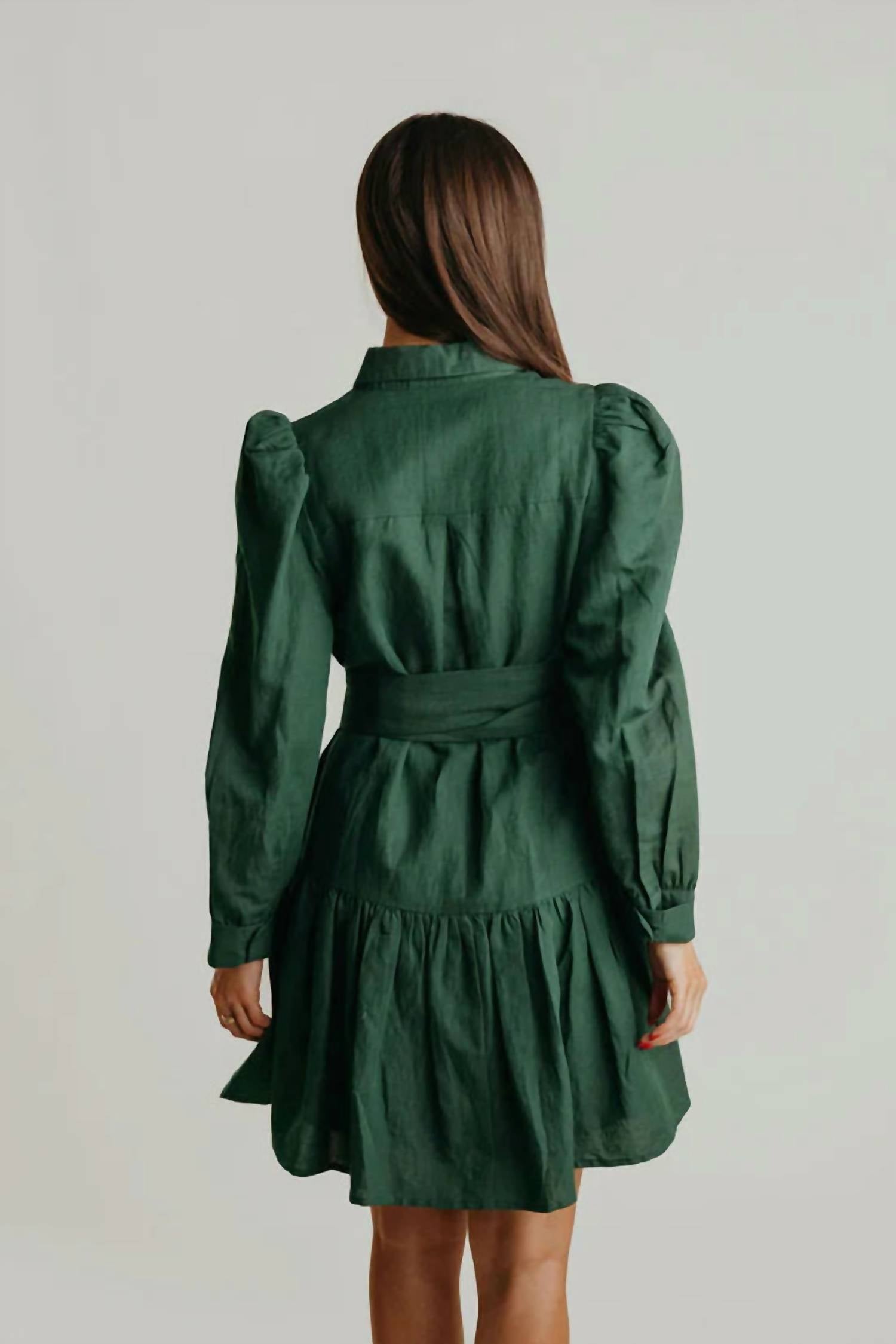 A flattering yet comfortable dress you'll be reaching for season after season. Introducing the Austin Long Sleeve Dress by LAROQUE, a sophisticated piece in a rich Hunter Green crafted from a luxe viscose-linen blend. This dress, designed with long cuff sleeves and a collar neckline, features a stylish button closure and an adjustable belt for the perfect fit. Ideal for a range of occasions, it combines elegance and practicality with a shirt silhouette. Care: Dry clean only.