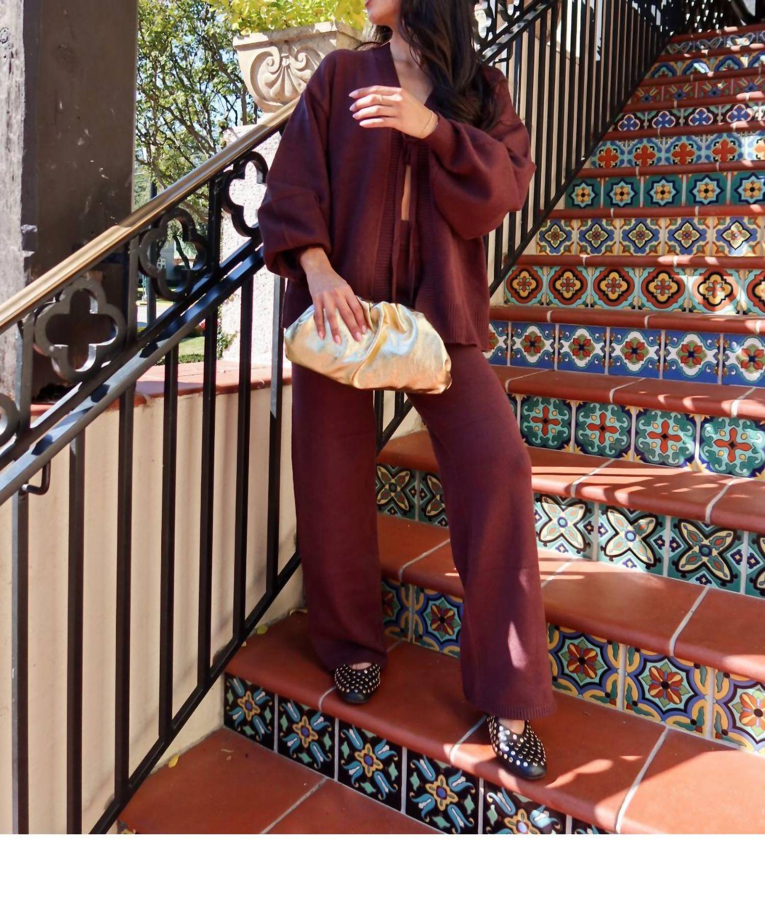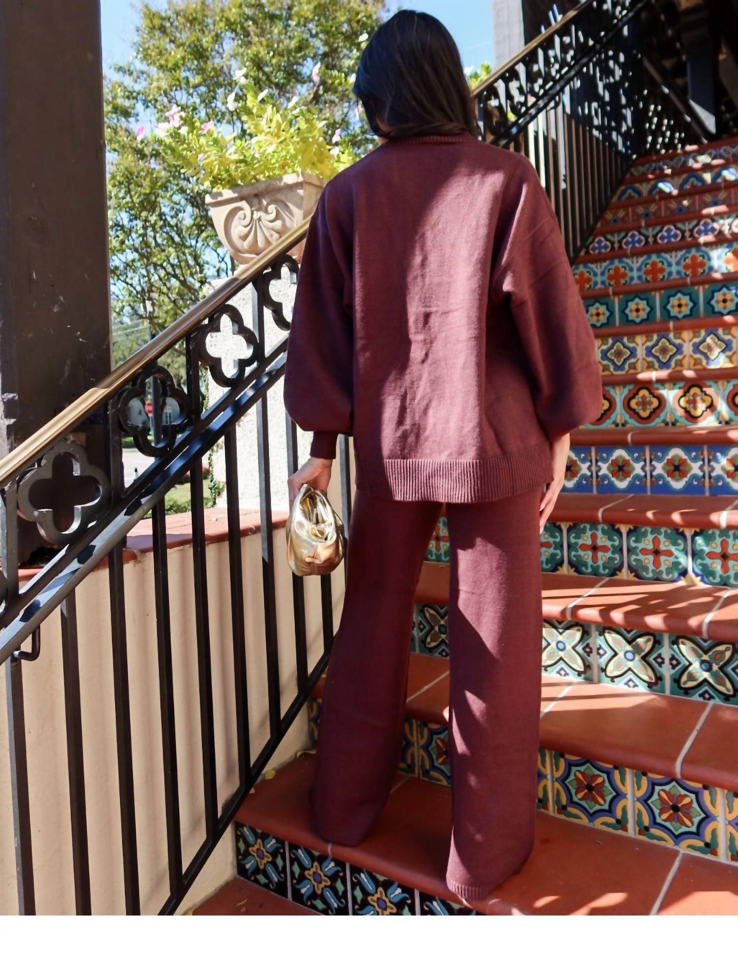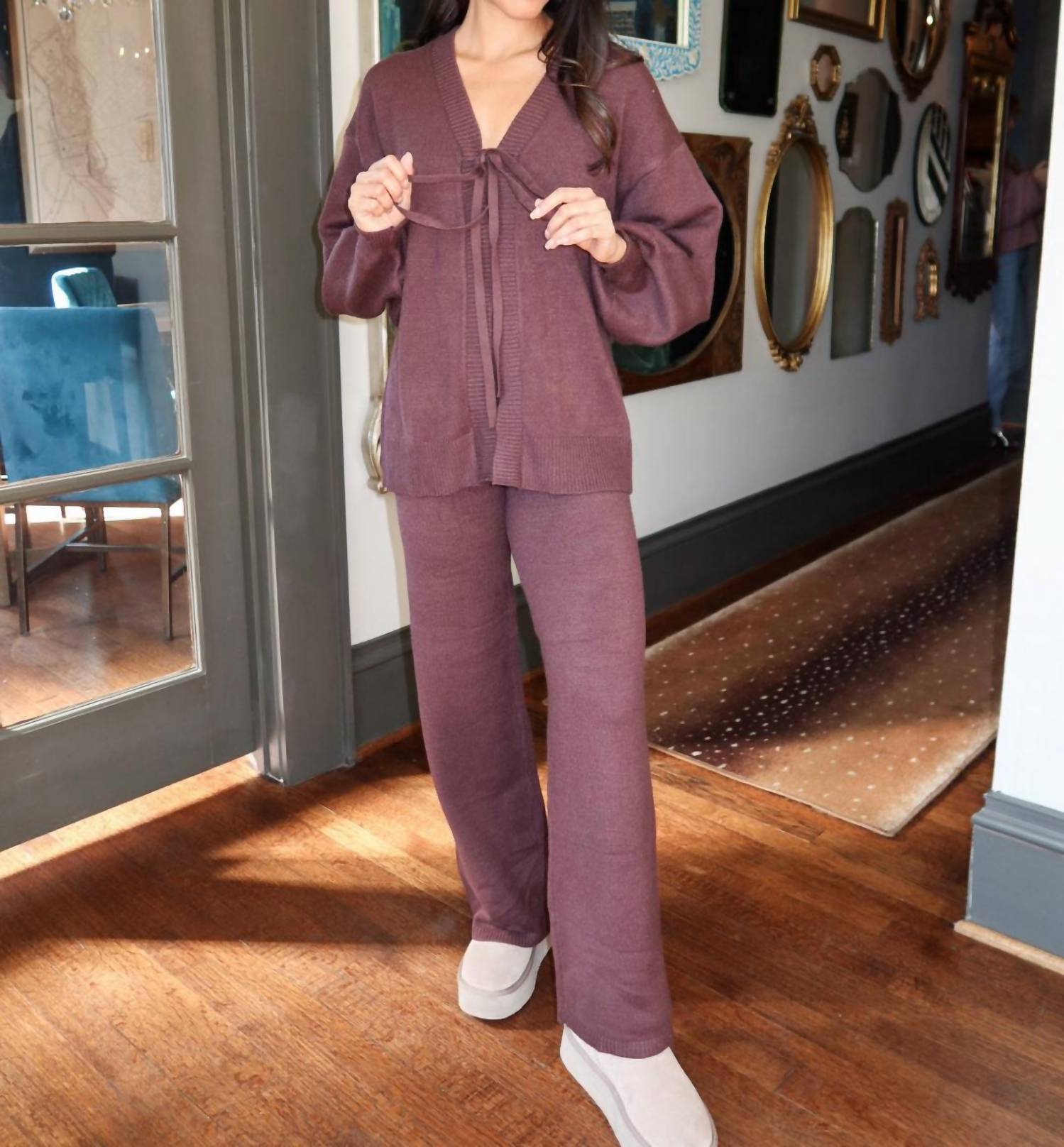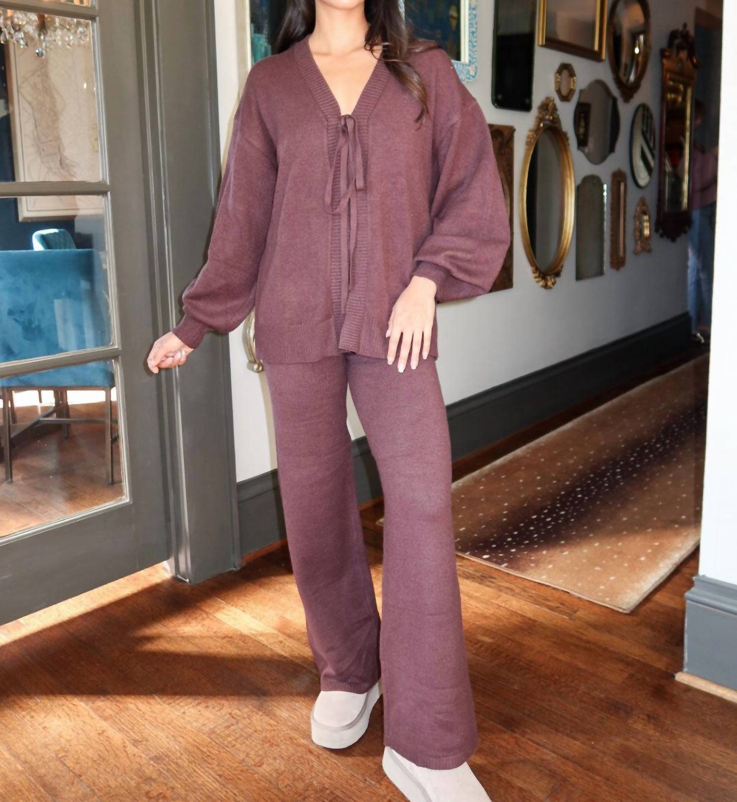 Loungewear doesn't have to be frumpy and this is exactly what we had in mind. Designed for a comfortable fit, this chic little number will be your favorite lounging-at-home look. Embrace effortless elegance with the Mocha Memories V-Neck Top and Flare Pants Set by Mimosa, crafted for comfort and style in a rich solid mocha knit. The top features long billowy sleeves and a sophisticated open front with an adjustable tie, complemented by matching wide-leg pants for a chic, coordinated look. Composition: 50% Cotton, 50% Polyester. Care: Hand wash cold, lay flat to dry. Model is 5'2" and is wearing a size small.
