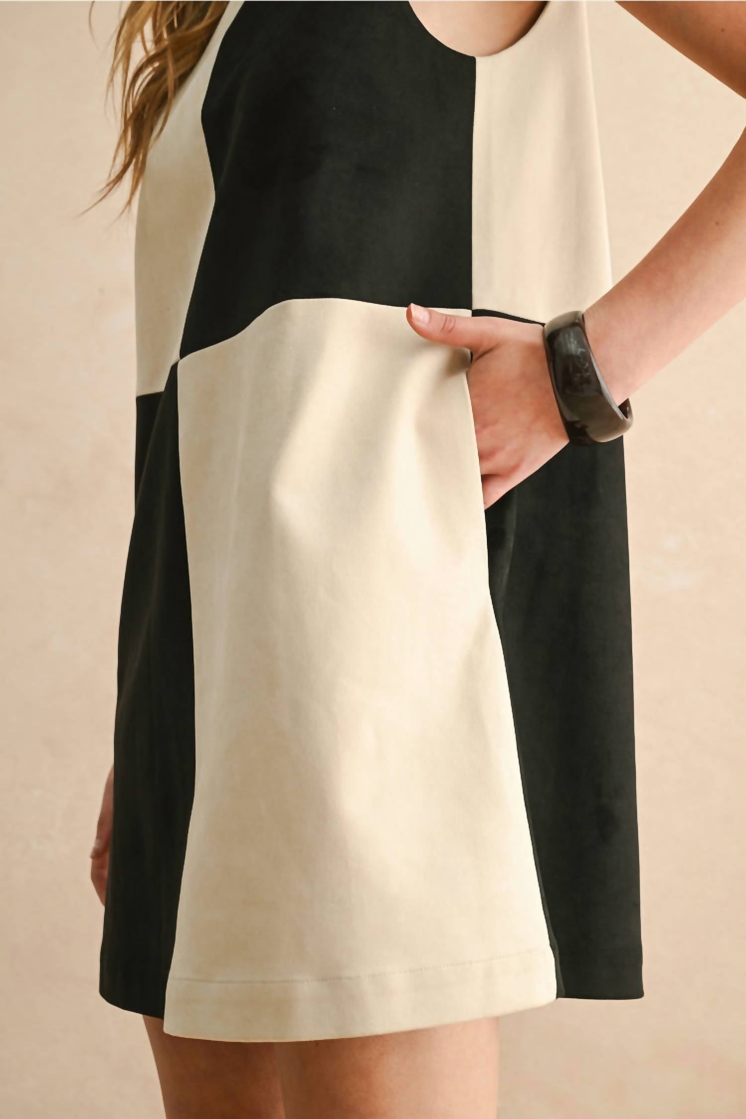 The perfect mini dress for those warmer months. Presenting the Suede Color Contrasted Shift Dress by MIOU MUSE, a sophisticated choice in charcoal combo perfect for spring. This sleeveless, shift silhouette embraces both comfort and style with its soft suede material and modern color-block design. Closure: Button closure. Care: Machine wash.