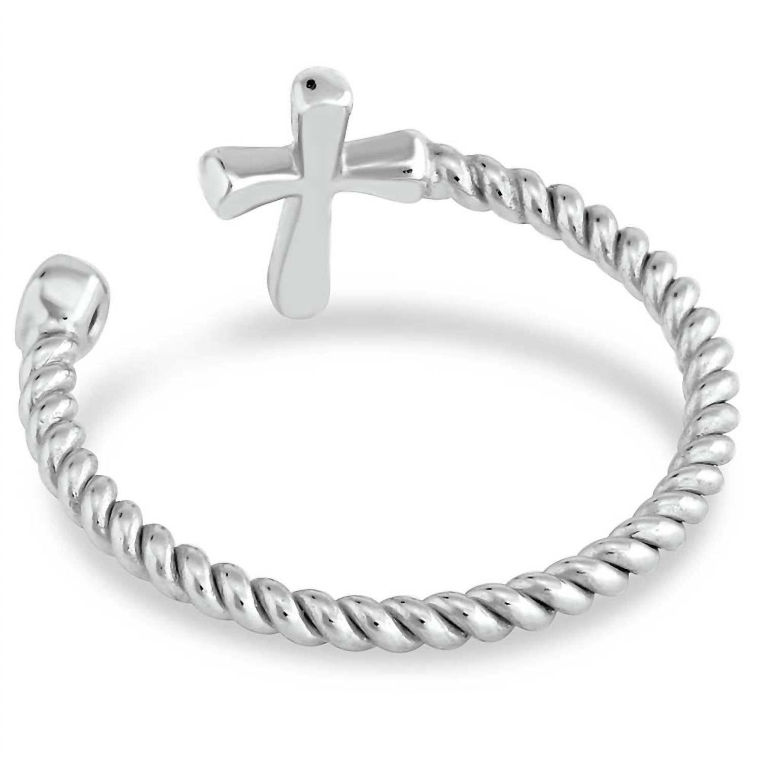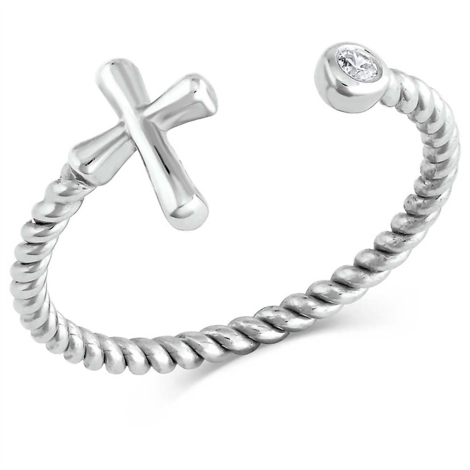 Wear this ring stacked or by itself... you can't go wrong. The Women's Faith On Full Ring by Montana Silversmiths is an elegant piece featuring a smooth silver cross and a sparkling cubic zirconia crystal, linked by a twisted rope design. Crafted with rhodium over a sterling silver base, this fine jewelry piece effortlessly combines classic style with modern flair. The open ring design is one size fits most, with dimensions measuring 0.35 inches in width and 0.08 inches in height.