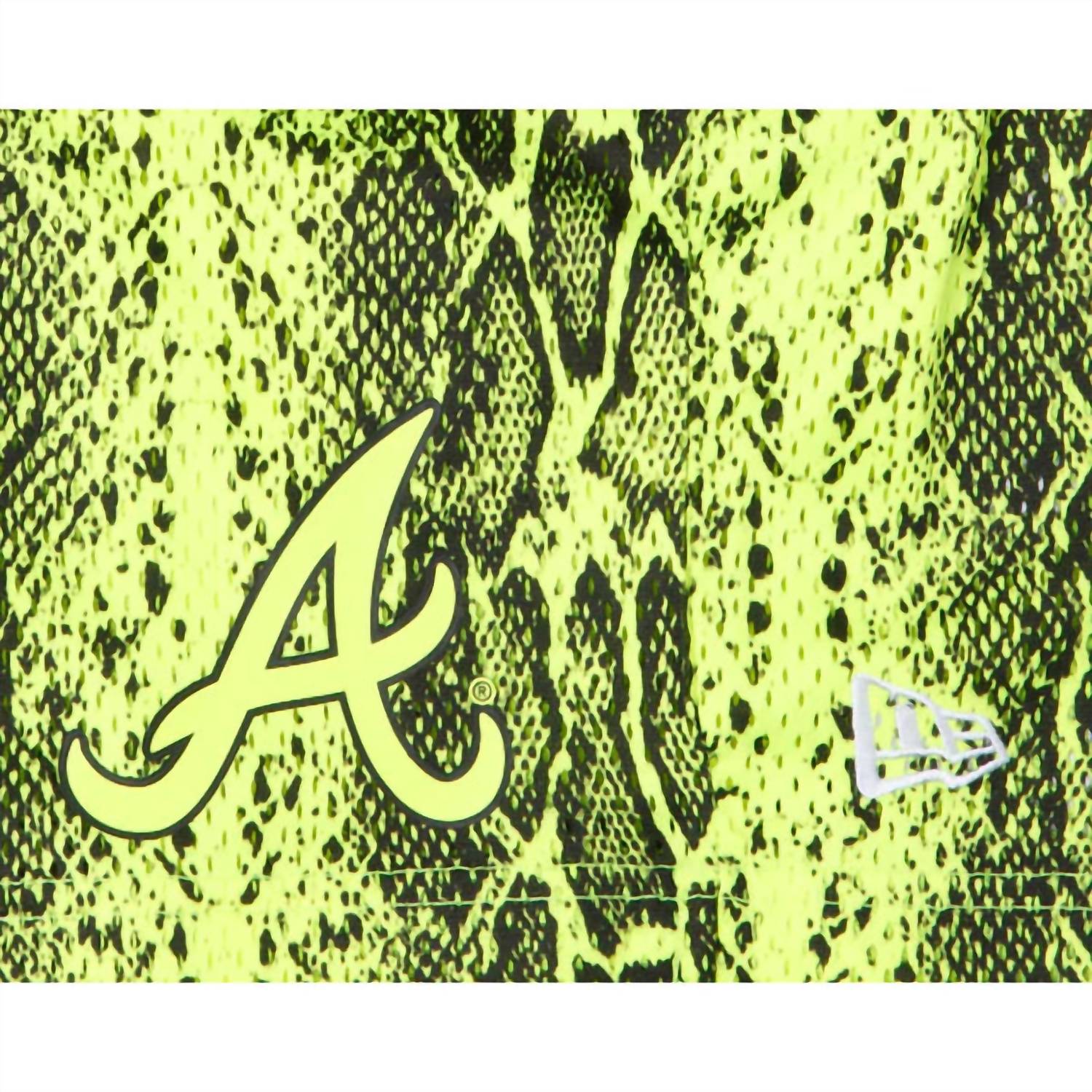 The Atlanta Braves Summer Pop Yellow Shorts feature an all over yellow snakeskin pattern with a screen-printed Braves logo at the left leg and a 1995 World Series logo at the right leg. Colorway: Neon Green Style Number: 13284291
