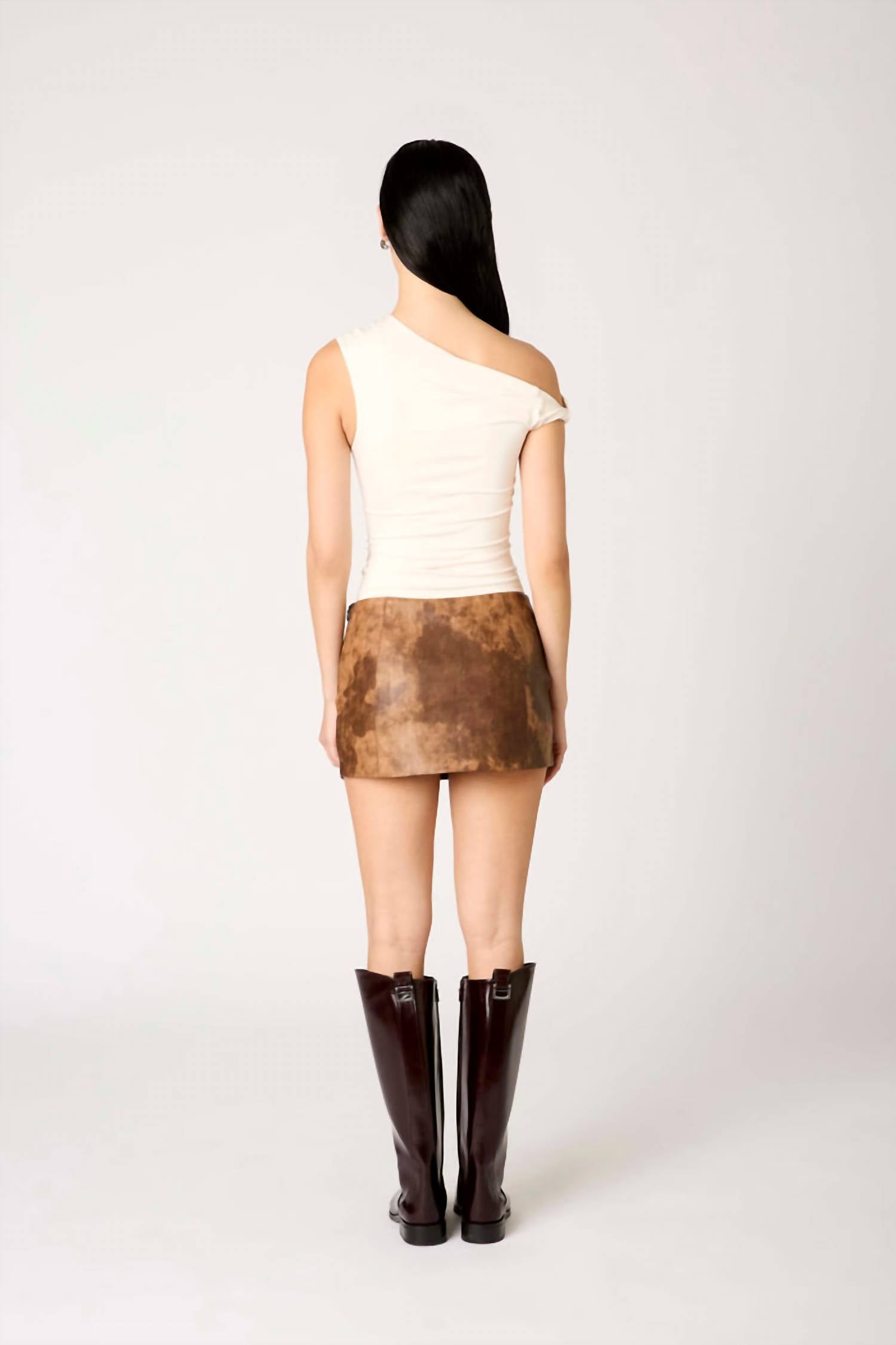 The cutest skort that combines style and functionality. Introducing the Moon Mini Skort by NIA, a striking piece in Saddle with a leather-like finish that's perfect for making a statement. Designed with a high-rise waist and slightly flared mini hemline, this skort showcases a sleek, structured silhouette. Composition: 50% Cotton, 50% Polyurethane. Closure: Side zipper. Care: Hand wash cold, line dry, iron at low heat if necessary, do not dry clean.