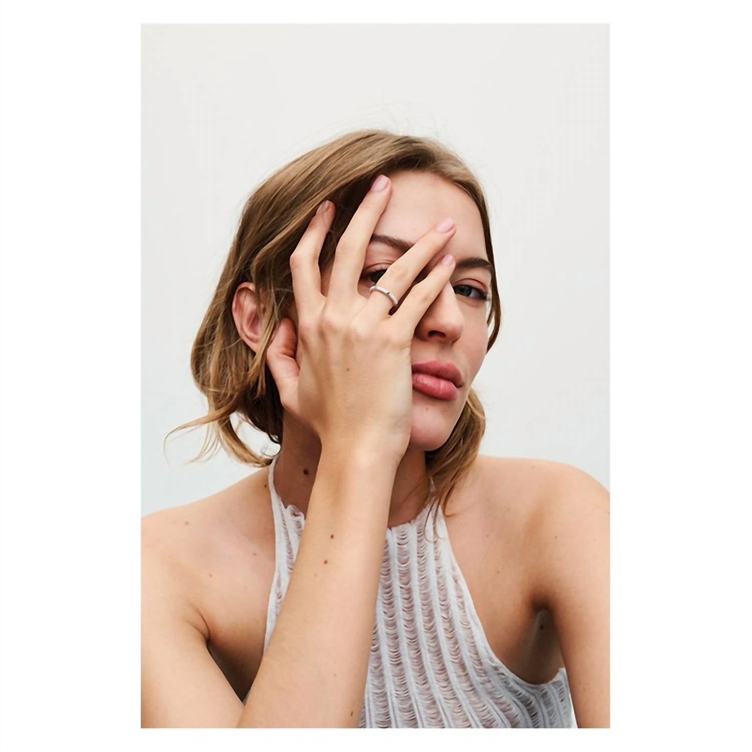 This ring will be your favorite go-to piece of the season. Add impact to your look with the Pandora ME Stones & Enamel Ring. This sterling silver ring features shiny white enamel punctuated by reverse pyramid-shaped indents set with sparkling stones. Pair it with other Pandora ME rings in different textures and enamel colors to create your own custom stack. Size 8.5