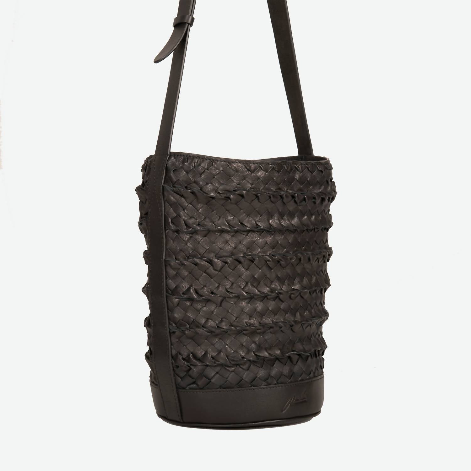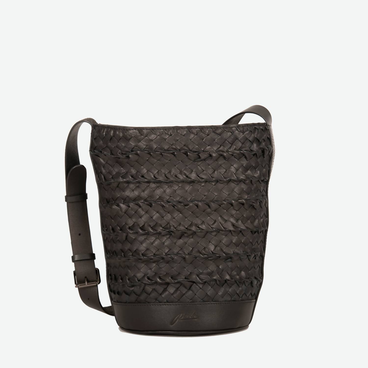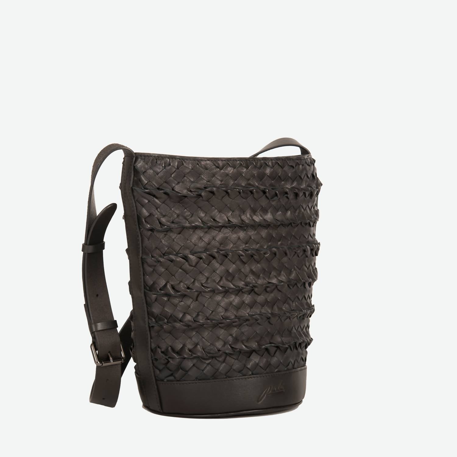 Meet the Women's Emery Woven Leather Shoulder Bag by Per Lei New York, an ideal choice for style and functionality. Crafted entirely from 100% hand-woven leather with leather trim, this black mid-sized bucket bag ensures durability and elegance. Featuring a long adjustable shoulder strap for comfort, a cotton lining, and a magnetic closure, it efficiently holds your essentials with interior back zipper and front slide pockets. Dimensions: 12 ½” H x 12” W x 7 ¾” D with a 16”-19” adjustable drop. Enjoy the unique color variations due to its special dip-dyed technique and keep it pristine with the included dust bag.