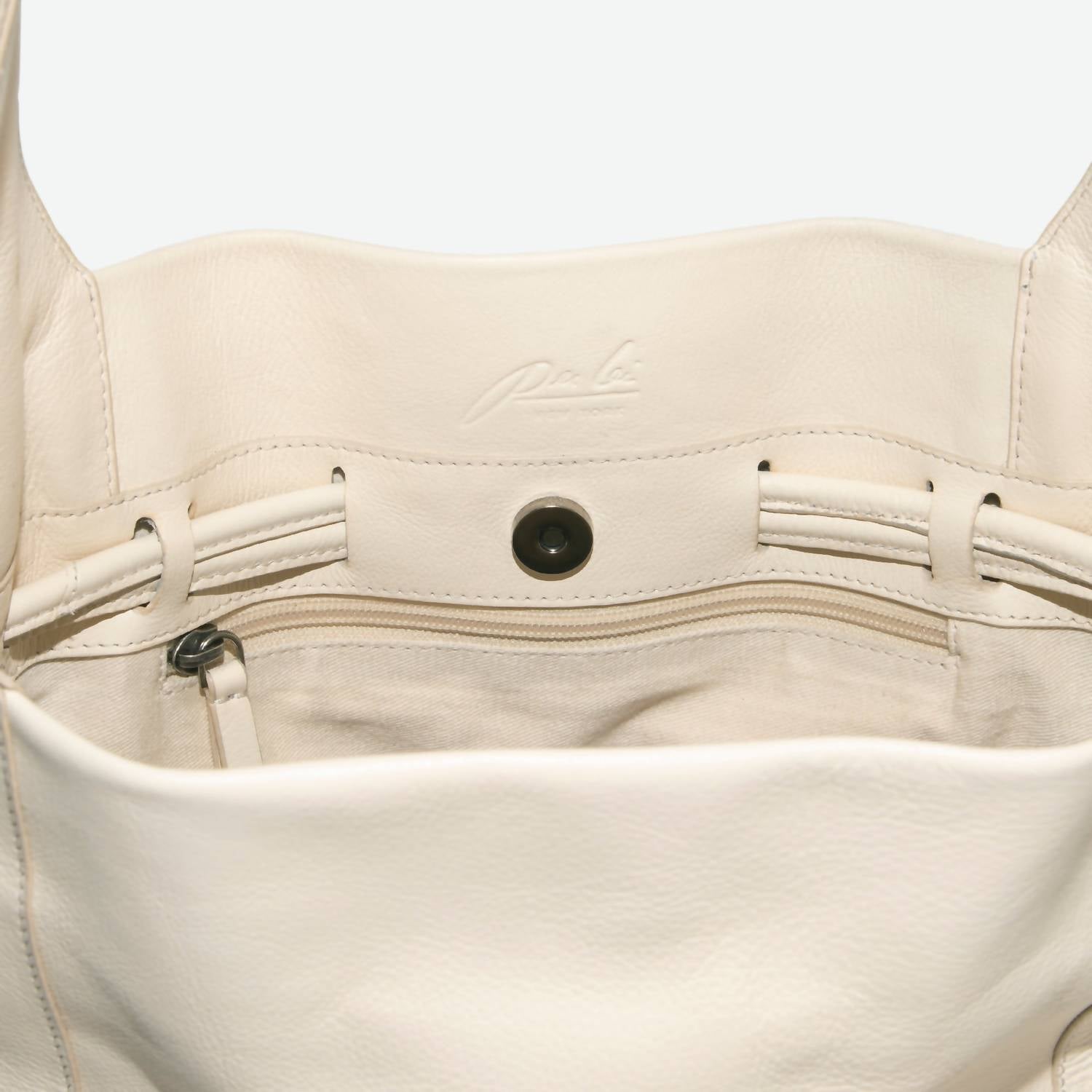 Discover the Women's Seneca Leather Drawstring Shoulder Bag by Per Lei New York, designed in a chic Crema hue. This elegant bag features a soft grain leather construction with a magnetic closure, complemented by a cotton lining and interior zipper for secure storage. Its spacious design measures 12" H x 11" W x 4" D with a 13" drop, perfectly accommodating up to a 13" laptop. The bag is completed with a back exterior pocket and includes a dust bag for protection.