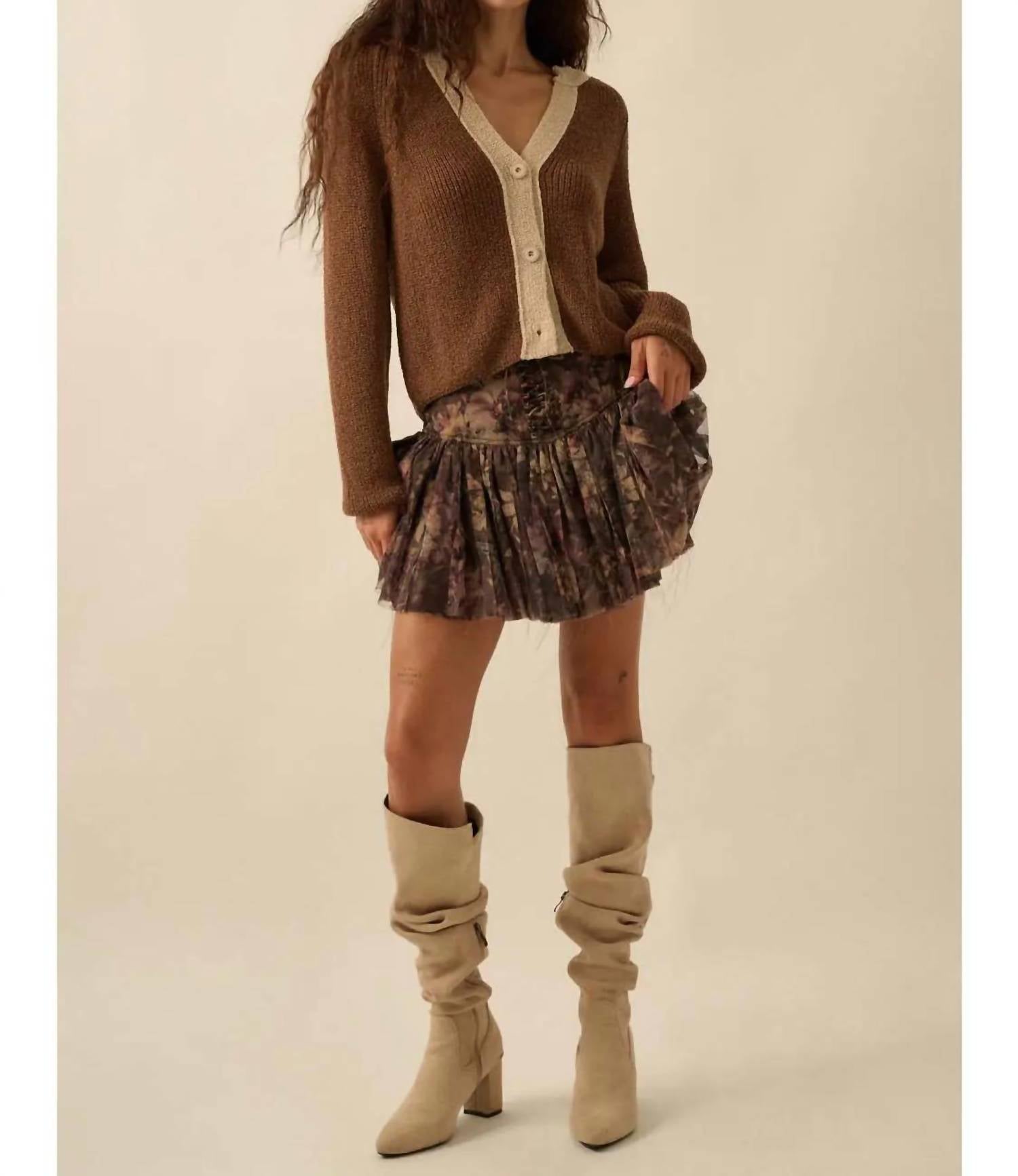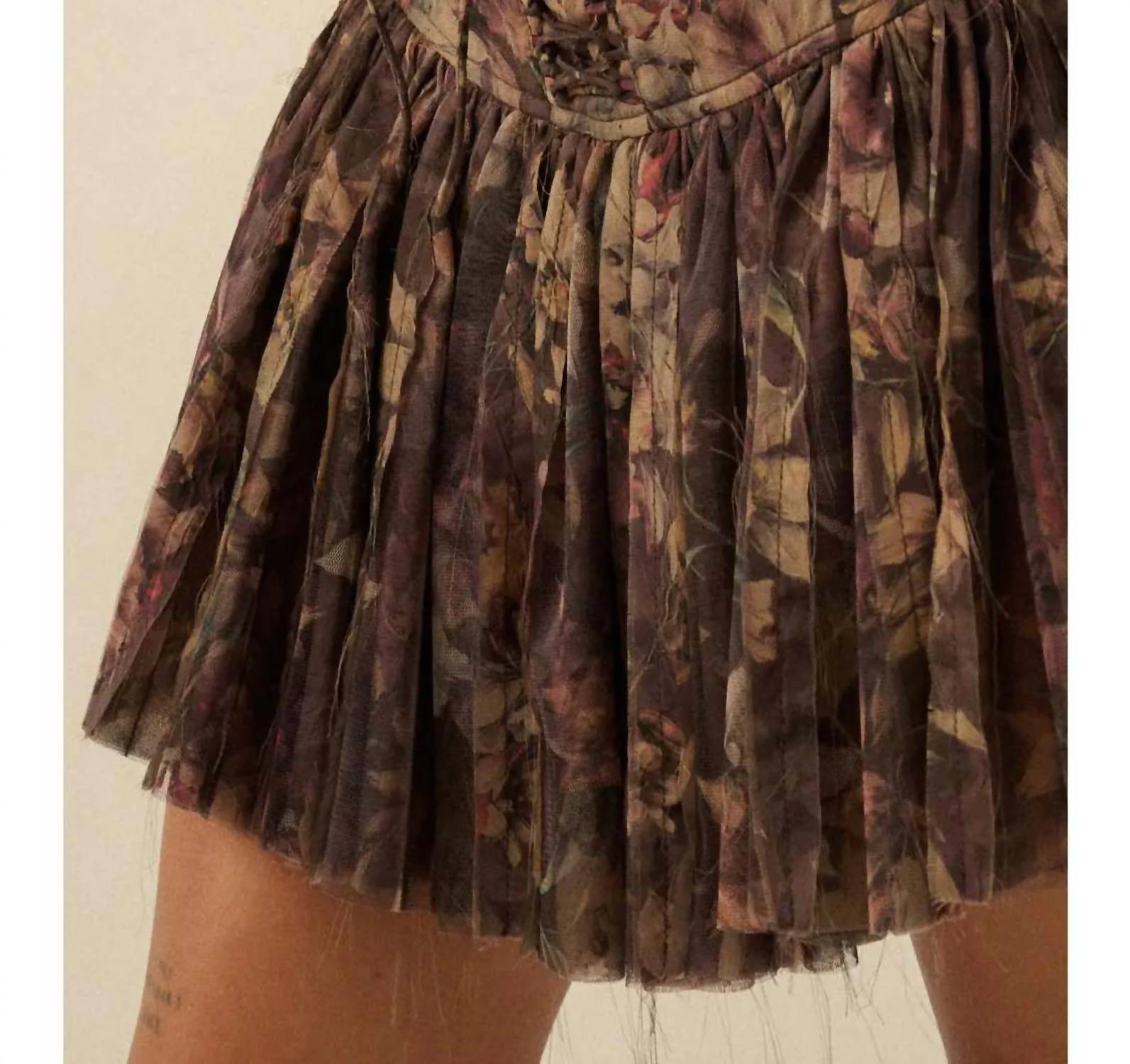 The cutest skort that combines style and functionality. Introducing the Blossoming Bliss Floral Drop-waist Mini Skort from PROMESA, a boho chic staple for your spring and holiday party wardrobe. This chocolate floral-print skort features a relaxed fit with a drop waist and thigh-length, enhanced by a pleated skirt bottom with a tulle overlay. Crafted from 100% polyester, it boasts a wide yoke waistband with a stylish lace-up detail and a raw-edge hem, with a smocked elastic back for comfort. Closure: Pull on. Designed in LA and imported. Model wears size S.