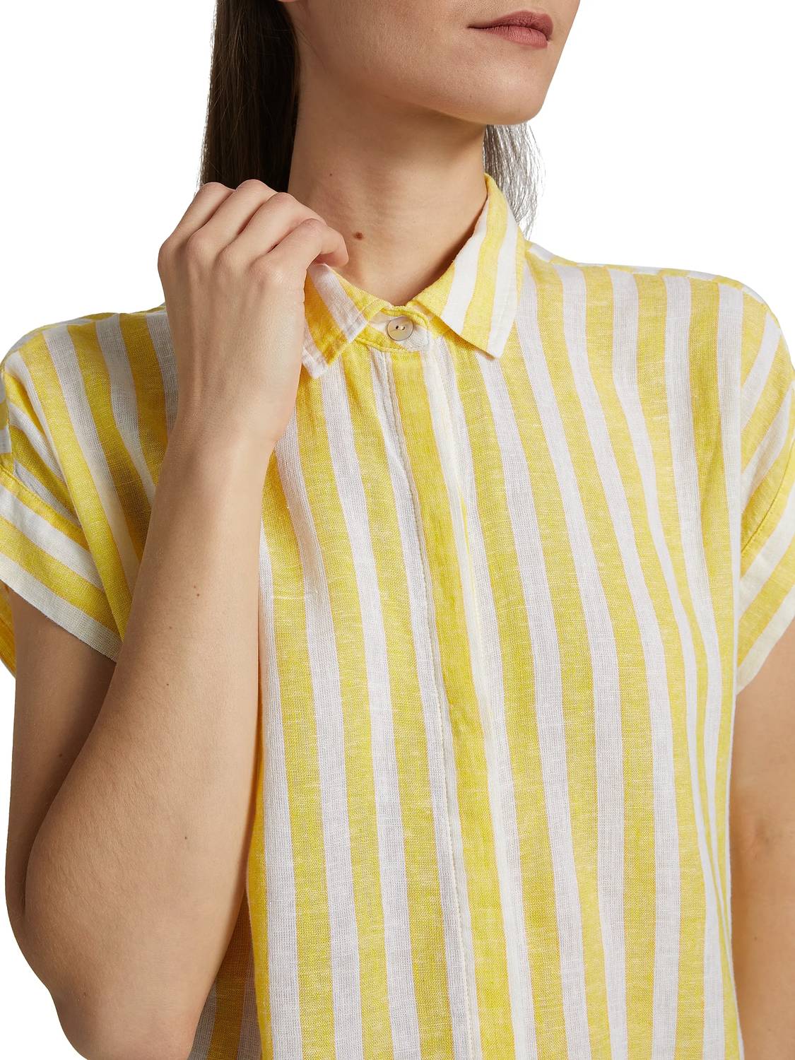 Pair this with your favorite jeans and slides for your next girls night out. The Rails Jamie Shirt in Daffodil Stripe is an elegant addition to your wardrobe, perfect for both work and leisure. Crafted from a luxurious linen blend featuring 55% linen and 45% Ecovero, this shirt showcases a spread collar and short sleeves. Its stylish stripe pattern and the button-front closure elevate any casual or formal ensemble. Measuring at a practical garment length of 27 inches, it requires hand washing to maintain its quality.