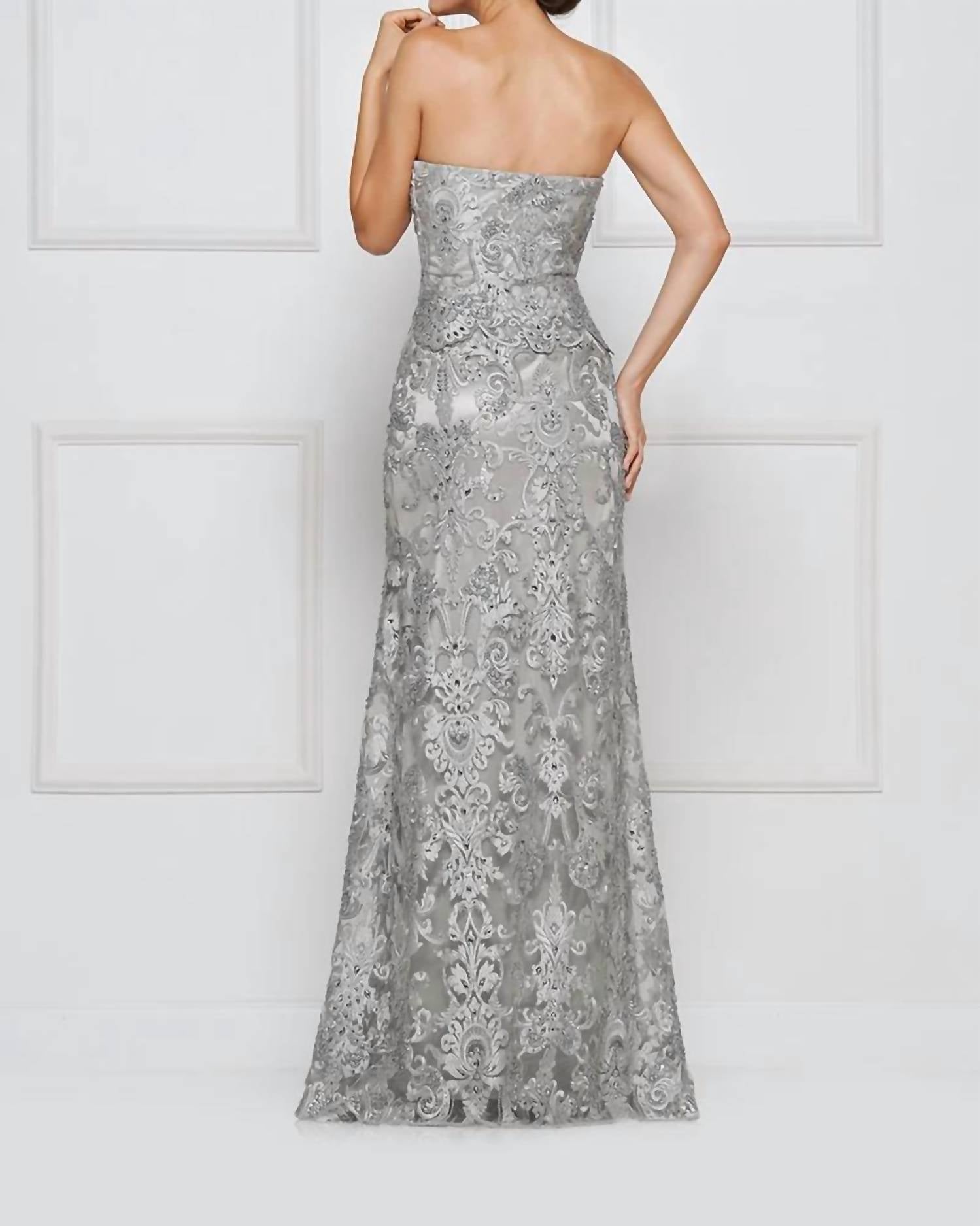 Just add a cute little clutch and a matching heel for the perfect event look. Introducing the Lace Embroidered Evening Gown by Rina Di Montella, a stunning choice for any prom or evening event. This strapless, floor-length gown in a sophisticated platinum hue features exquisite lace embroideries and includes a matching shawl for added elegance. Crafted from lace material, this piece is designed with a sweetheart neckline and an A-line silhouette, offering a timeless look. Made with a zip closure, this gown embodies vintage allure with a modern touch.