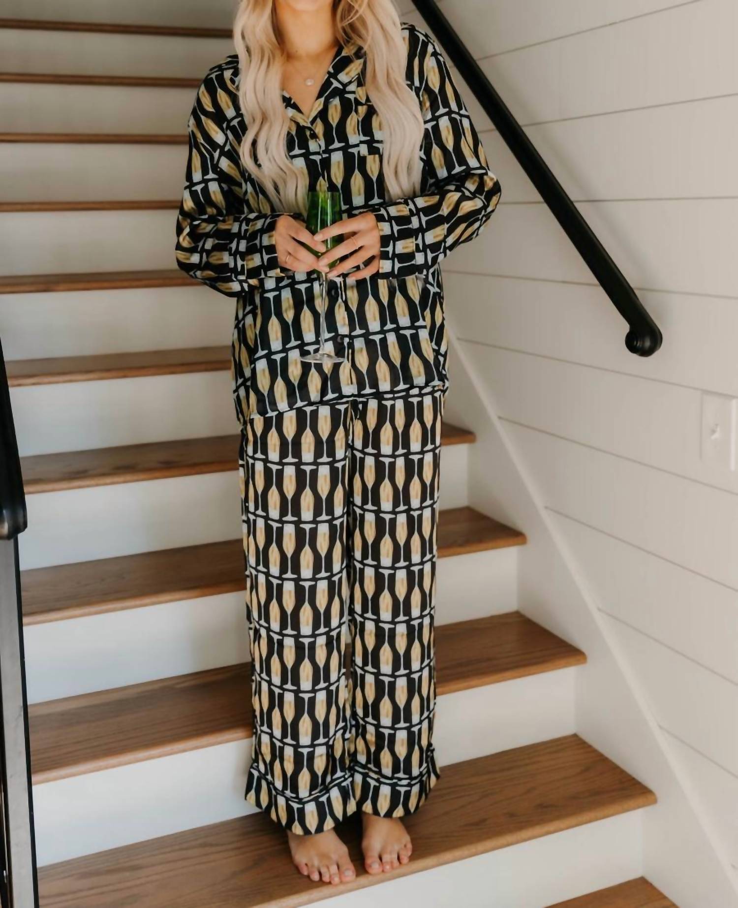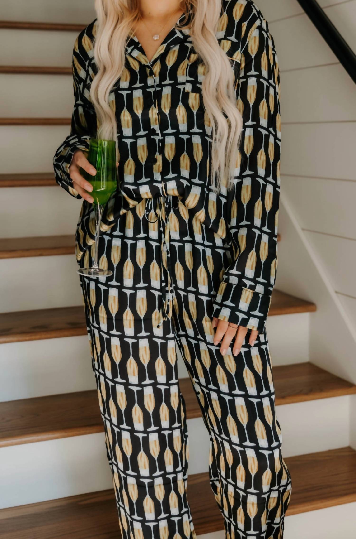 Pair with cozy slippers for pajama perfection. Introducing the Classic Pajama Set by Show Me Your Mumu, a luxurious choice in Champagne Silky for stylish relaxation. This women's pajama set features a graphic pattern with a classic collar and long sleeves, perfect for the spring season. Crafted with comfort in mind, the set is designed in captivating colors for a chic bedtime look. Care is effortless with machine wash instructions.