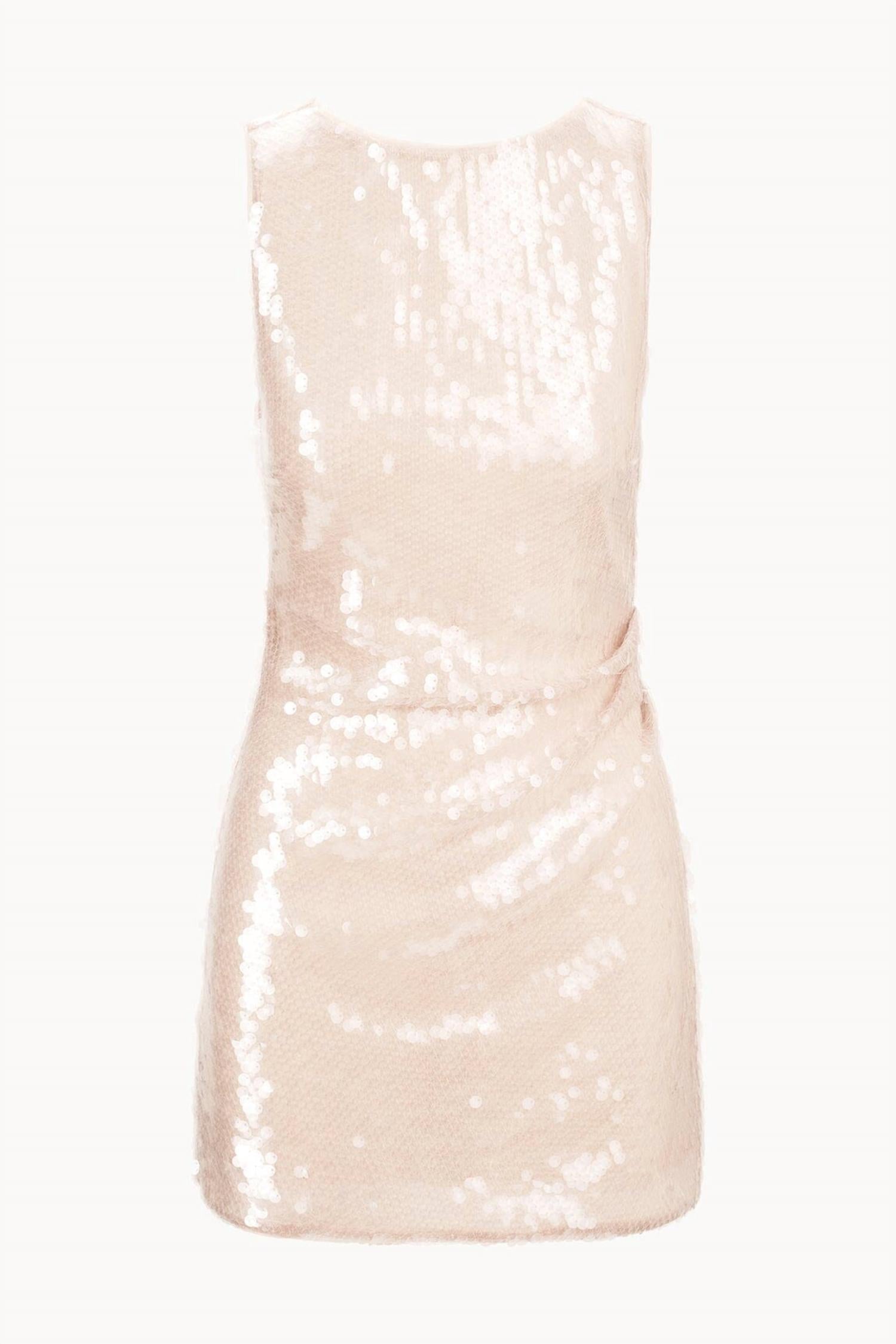 Show off just the right amount of skin in this adorable assymetrical dress. Unveiling the Eton Mini Dress by STAUD, an exquisite choice for your next holiday party. This sleeveless dress is crafted from 100% polyester with a lining made of 86% polyamide and 14% spandex, ensuring both comfort and style. Featuring a chic boatneck design and an elegant asymmetric draping at the waist, it highlights the season's quiet luxury trend. Closure: Hidden center back zipper. Care: Machine wash. Color: Moon.