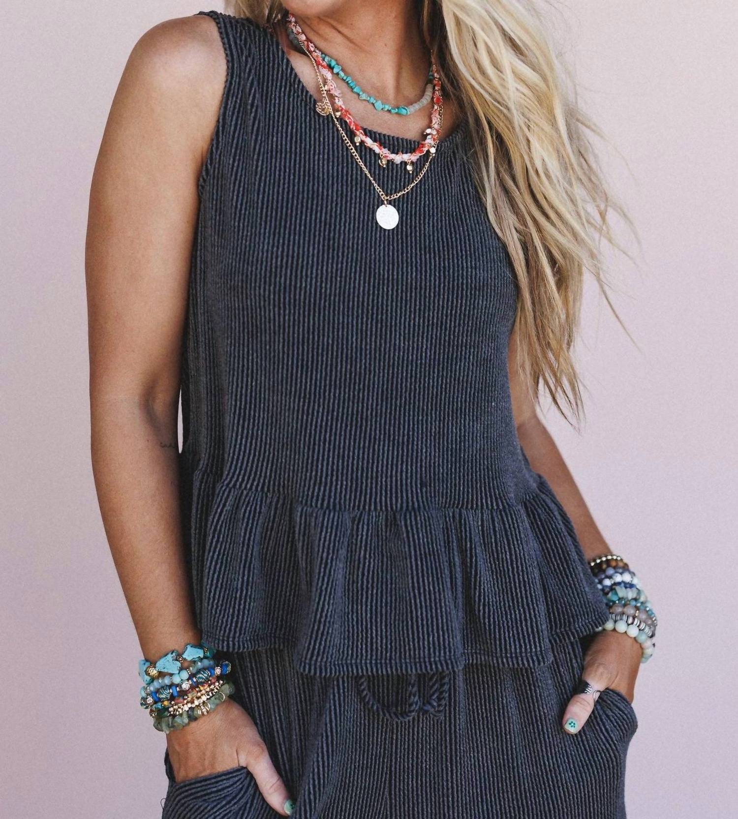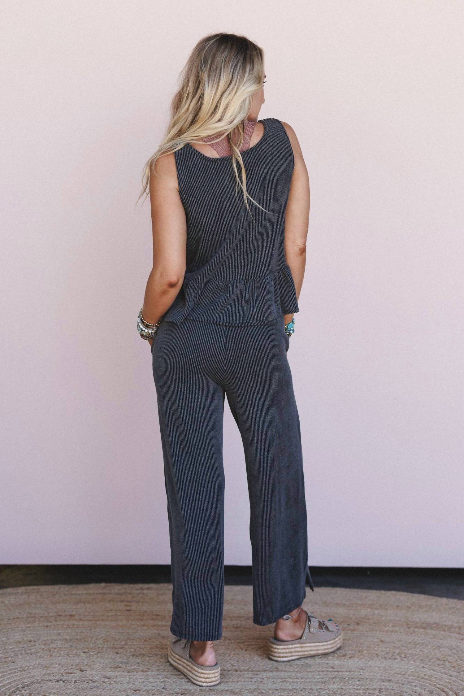 A set so cute you'll never want to take it off. Designed to look good while lounging, this little number is the perfect outfit for hanging at home in style. Discover the Only You Top and Pants Set by Three Bird Nest, a chic choice from their exclusive collection, The Nest. Featuring a sleeveless peplum tank and wide leg drawstring pants in textured grey, this set is designed for summer vacation elegance. Made in the USA, this minimalist ensemble is composed of 76% Polyester, 21% Rayon, and 3% Spandex, offering both comfort and style. Care for it by hand washing cold and laying flat to dry. Available in sizes ranging from Small (Bust: 34", Waist: 24" to 38", Length: 21" top, 37" bottom) through X-Large.