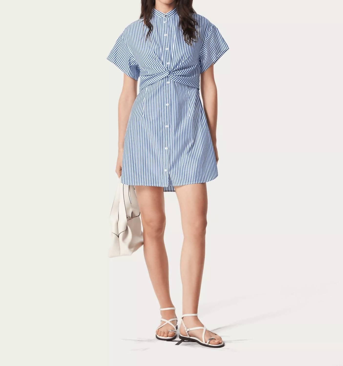 A short and breezy dress for those warmer days. Rag & Bone's Women's Gretchen Striped Shirt Dress is a chic addition to any spring wardrobe, effortlessly blending a boho chic trend with tailored sophistication. This mini dress features short sleeves and is crafted from 100% cotton poplin, offering a structured yet lightweight feel. It boasts a length of 36 inches for size 4 and includes thoughtful design elements like a gathered twist at the front, a band collar with metal dome button, and faux horn buttons down the center for an elegant finish. Imported with a hidden zipper and hook-and-eye closure at the side seam, it's easy to care for with machine wash warm and tumble dry instructions. Model is 5'11" wearing size 2 with a slim fit true to size.