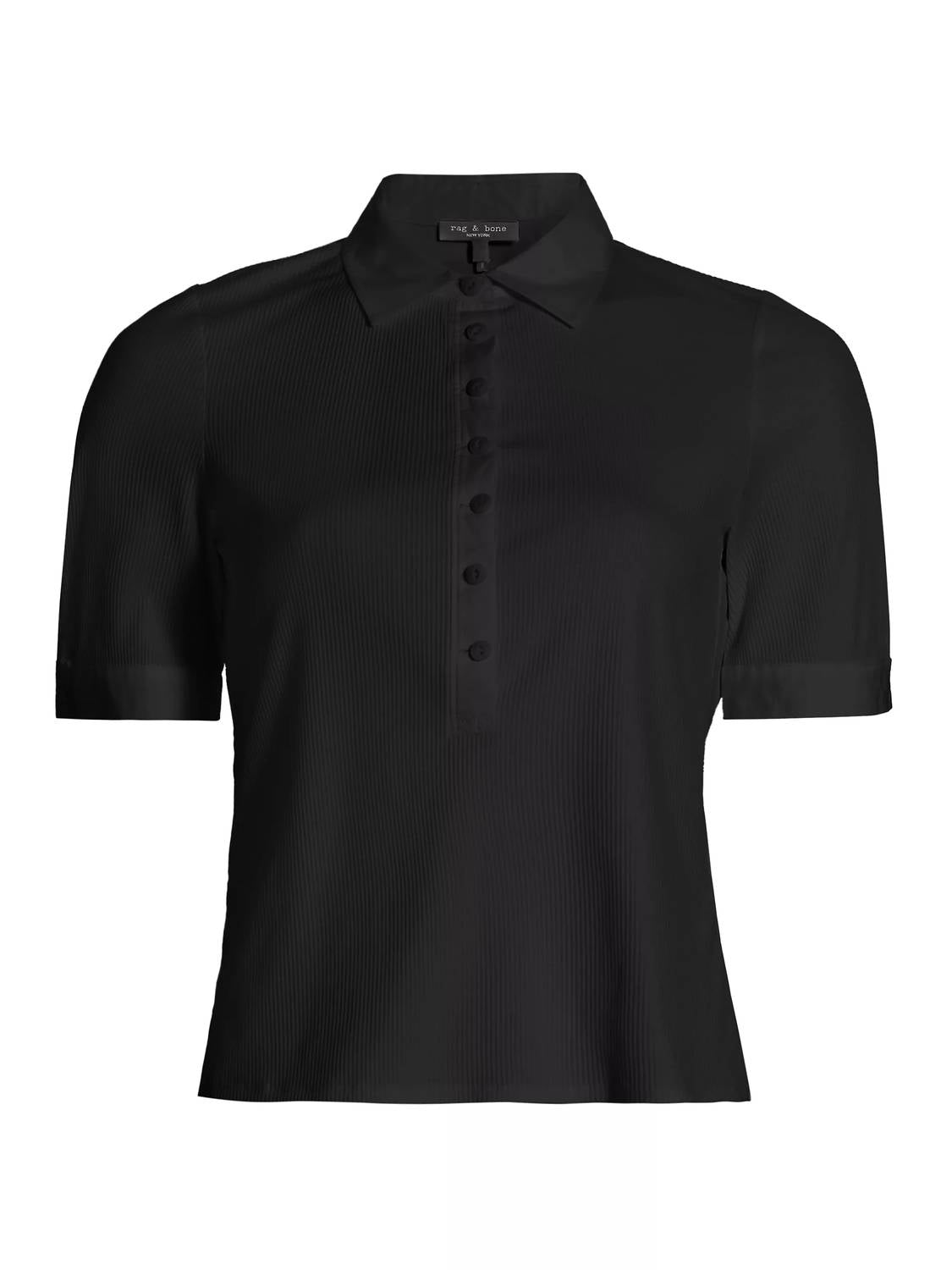 The short sleeve tee you'll want in every color. Introducing the Ribbed Mix Media Polo Shirt by Rag & Bone, a sleek black essential for your wardrobe. This women's polo features a tailored fit with short sleeves and a spread collar. Crafted from a blend of 45% cotton, 45% modal, and 10% spandex, it ensures comfort and style. Closure: Button half-placket. Care: Machine wash. Measurement: Approximately 20" from shoulder to hem and a bust of about 33". Model is 5'10" and wearing a US size Small. Imported for quality assurance.