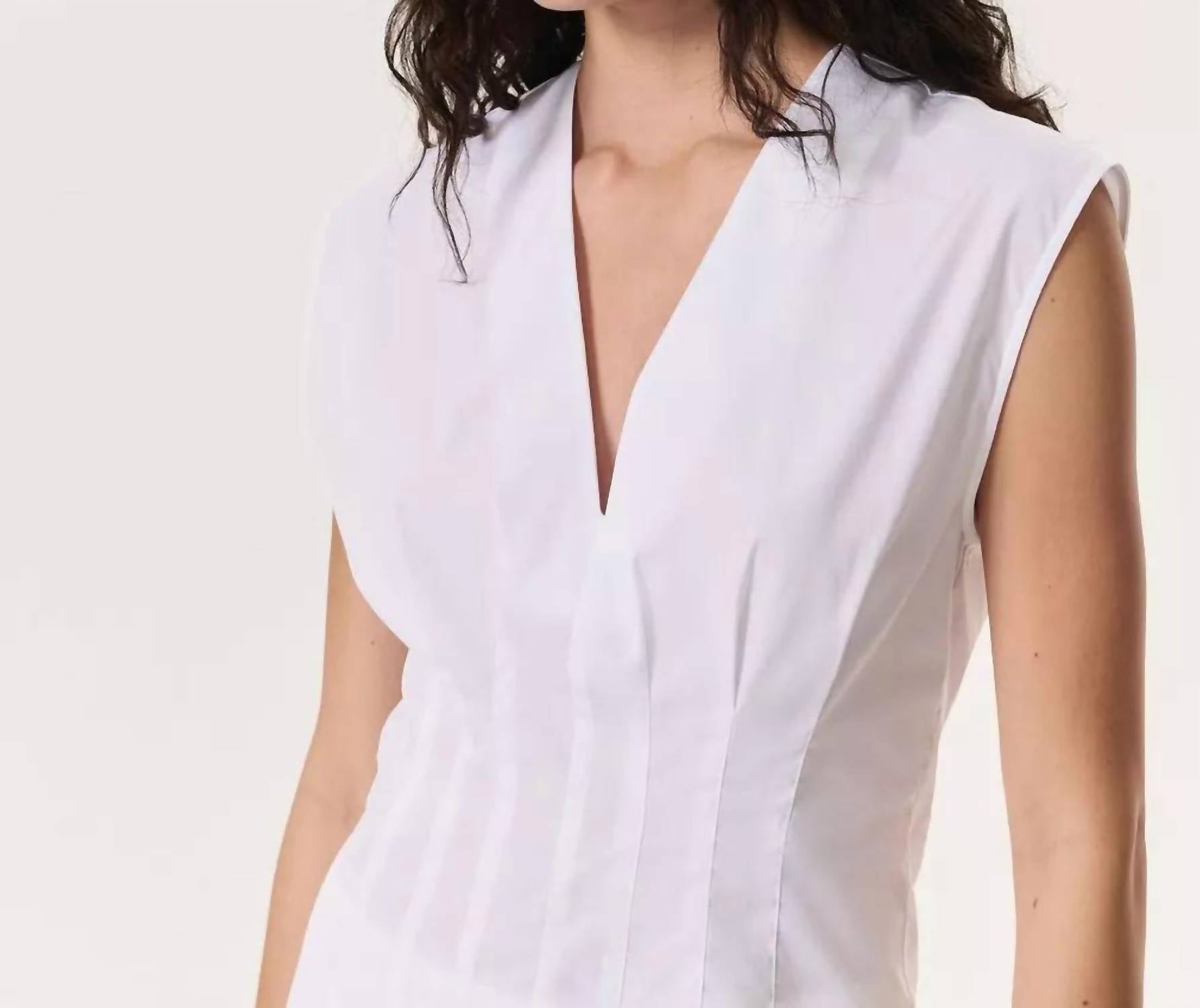 A timeless blouse that will never go out of style. Introducing the Ines V-neck Cotton Poplin Top by Rag & Bone, a piece of effortless elegance in textured white cotton. This sleeveless top is crafted from 100% cotton with an A-line silhouette and cinched waist, offering a flattering and breathable fit for warm-weather occasions. Origin: Imported. Closure: Invisible zipper at center back. Care: Machine wash cold with like colors, only non-chlorine bleach when needed, tumble dry low, and if needed, low iron.