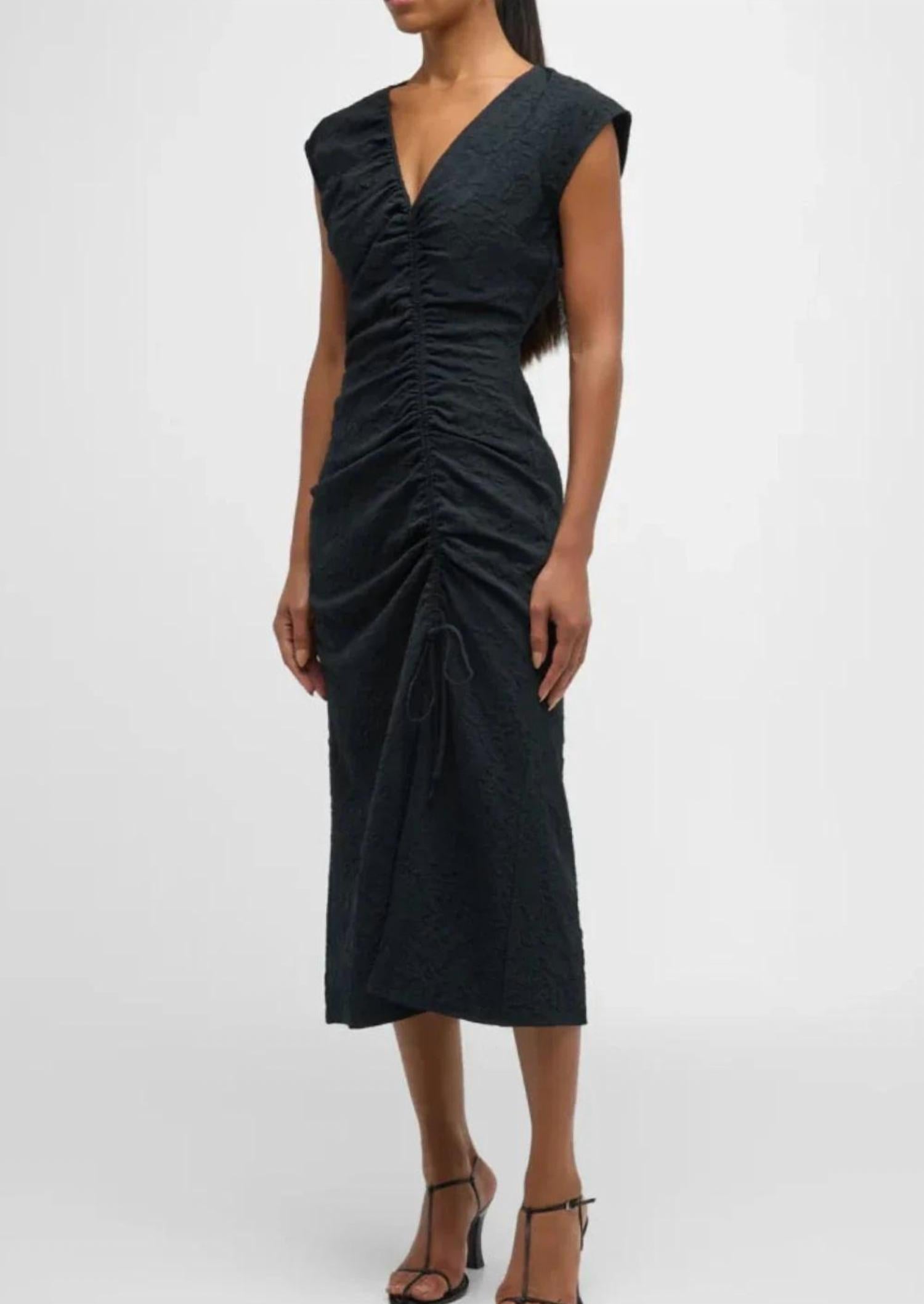 Introducing the Auren Dress by Rails, a refined choice in Black Jacquard. This sleeveless midi dress showcases an asymmetric ruched front and V-neckline in a chic column silhouette. Crafted from a polyester/spandex blend, with an invisible back zip closure. Length: Falls below the knee at 48.5". Care: Hand wash or dry clean. Origin: Imported.