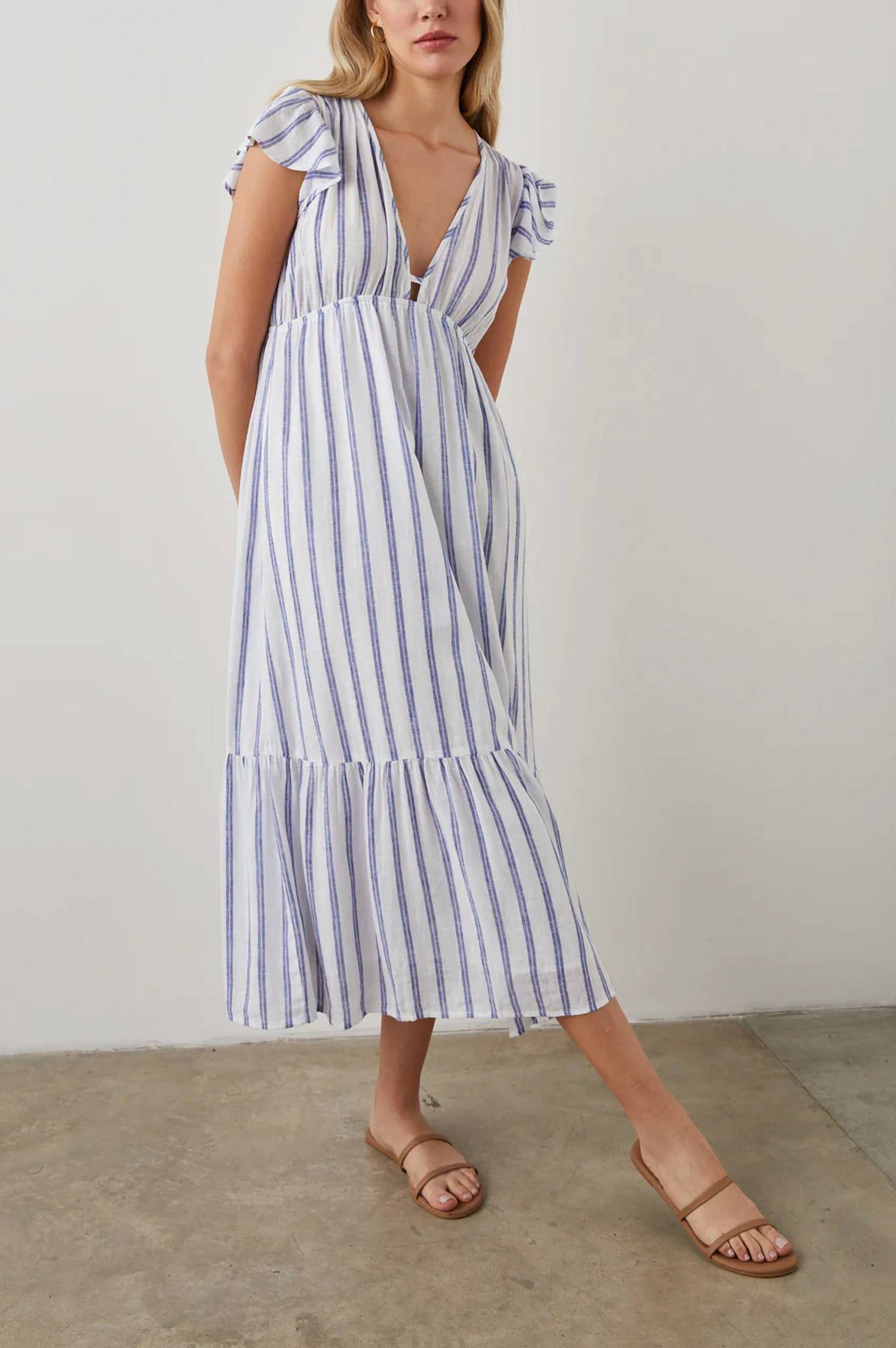 Features a v-neckline with a delicate cutout, flutter sleeves, and an empire waist. Rendered in a crisp cotton poplin and blue-and-white stripes. Fabric: 55% Linen 45% Rayon. Hand wash cold. True to size. Model is wearing size S. Front Body Length: 48 3/8” (Measured from Small).