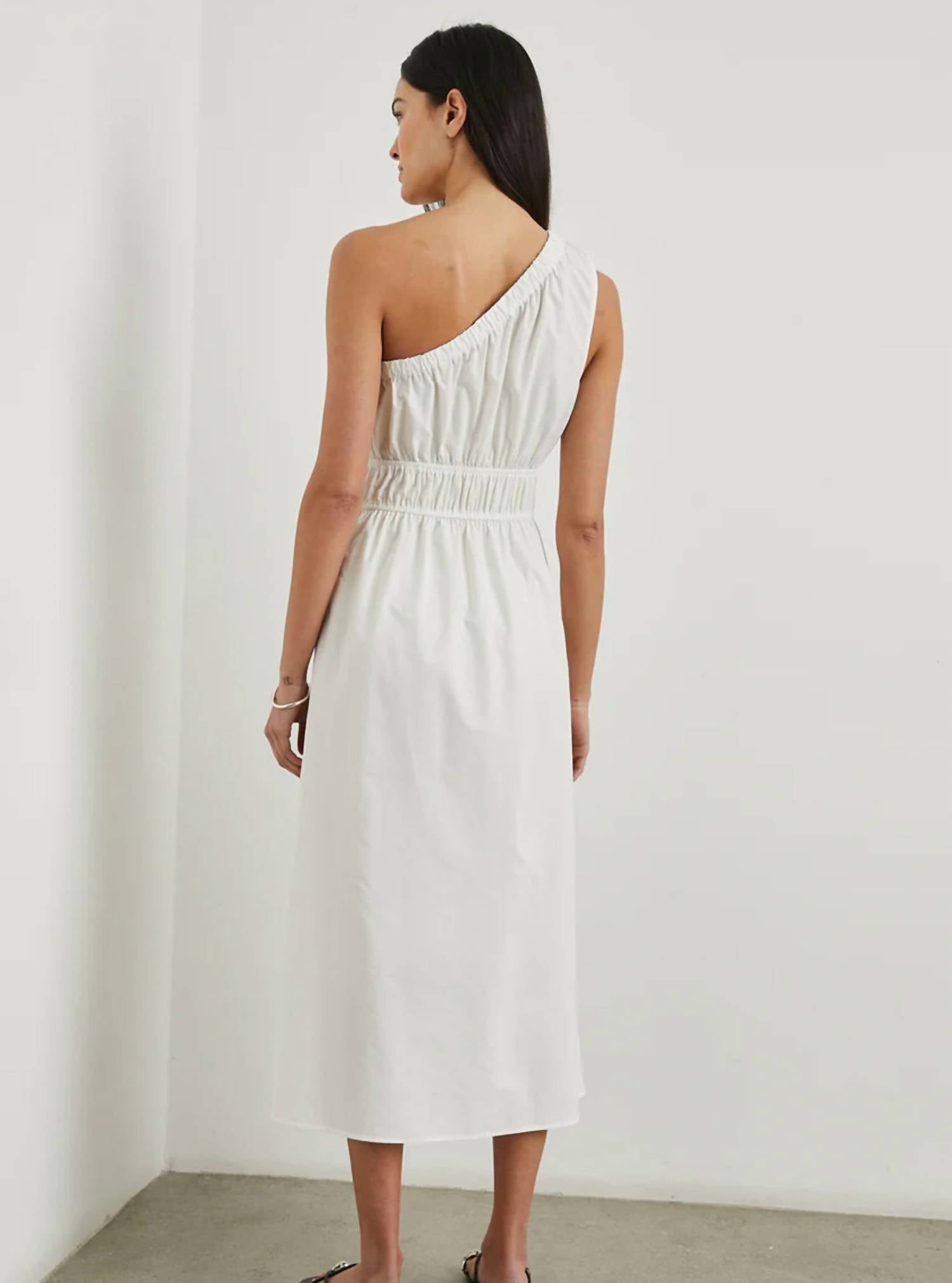 Just add slides or mules and you are good to go. Discover effortless elegance with the Selani Dress in White by Rails, a perfect blend of style and comfort. This sleeveless, midi-length dress is crafted from a cotton blend for a lightweight feel, featuring a shirred waistband and asymmetrical neckline to enhance its unique structure. Composition: 55% Cotton, 45% Tencel. Closure: Pull on. Care: Hand wash. Designed without pockets, it complements both casual sneakers and chic heels for versatile wear.