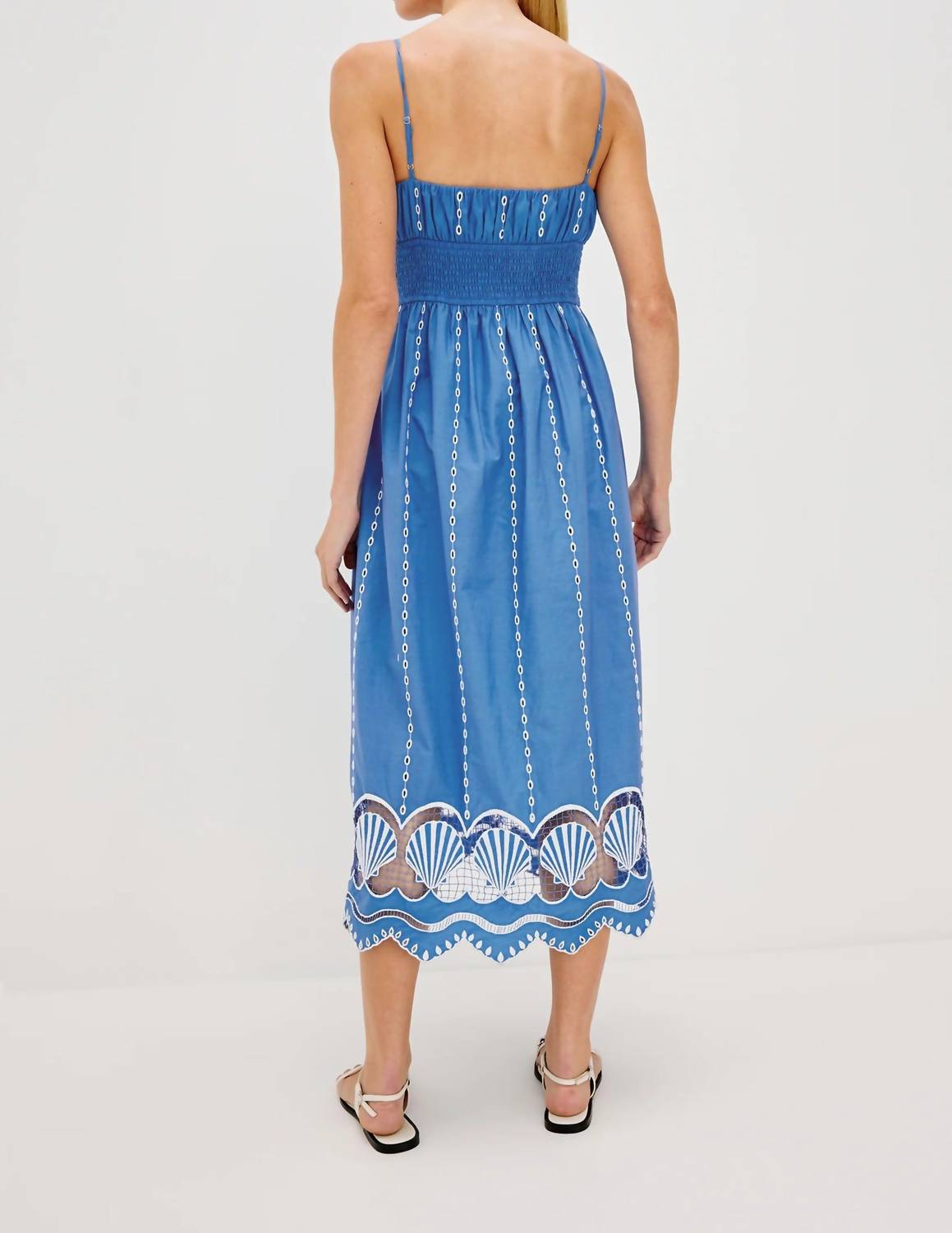 Just add slides or mules and you are good to go. Introducing the Rails Murano Dress, a summer staple in a lovely French Blue hue. This patterned dress features spaghetti straps and an A-line silhouette adorned with delicate shell embroidery and a charming scalloped hem. Made from 100% cotton, it's 42.125 inches in length and designed for ultimate comfort with a pull-on closure. Care for this boho chic piece involves hand washing and laying it flat to dry, ensuring it retains its coastal-inspired charm.