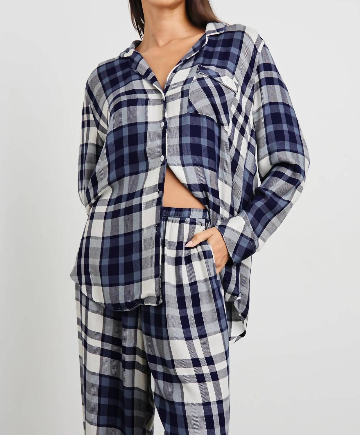 A set so cute you'll never want to take it off. Designed to look good while lounging, this little number is the perfect outfit for hanging at home in style. Introducing the Luna Pj Set from Rails, a must-have for the fall season in a chic Lake Plaid. These long-sleeve pajamas are crafted from 100% rayon, offering a lightweight and breathable feel akin to cashmere. Made with a classic collar design, this loungewear set ensures you stay stylish while embracing maximalist trends. Care for these imported PJs is simple with hand wash instructions to maintain their softness.