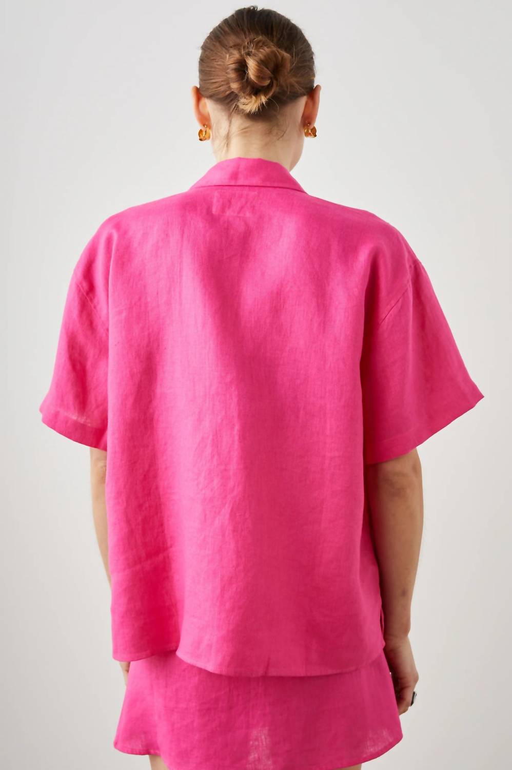 A timeless blouse that will never go out of style. Introducing the MacKinley Linen Shirt by Rails, a chic choice for your summer wardrobe rotation. This oversized, short sleeve blouse in a vibrant raspberry hue effortlessly elevates casual attire. Crafted from 100% linen, it features a functional button closure and a statement chest pocket for added flair. With a minimalist, solid pattern, this top is perfect for holiday parties or a casual Thanksgiving gathering.