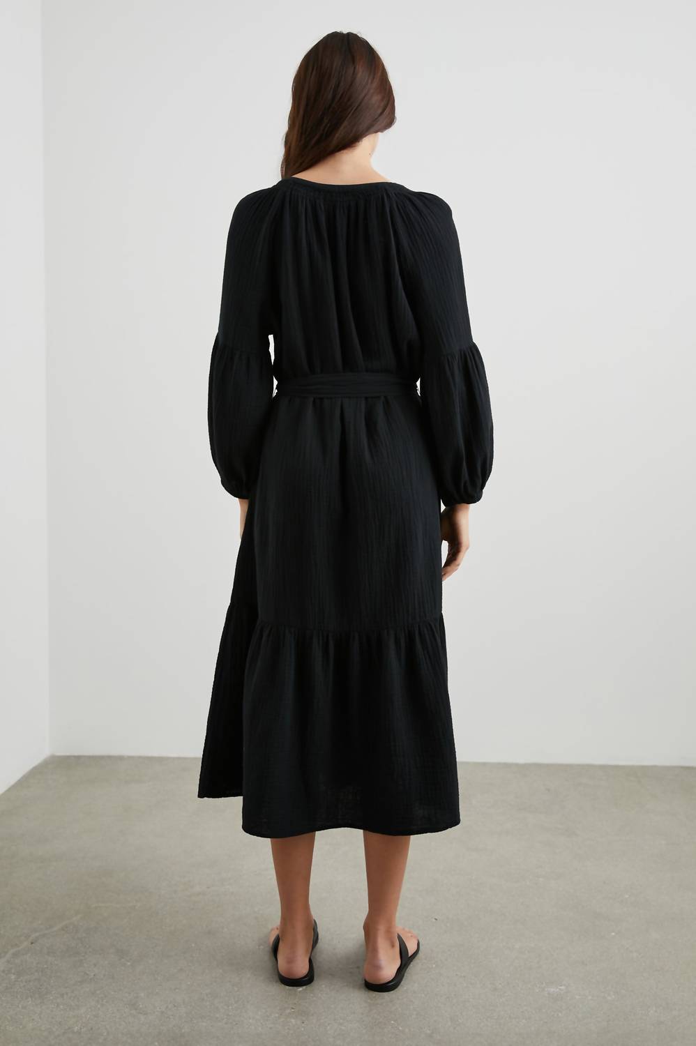 Introducing the Vittoria Dress by Rails, an effortlessly chic little black dress that makes a statement. Crafted from 100% organic cotton, this midi-length piece features a textured design and relaxed three-quarter sleeves for a sophisticated look. The pull-on closure, v-neckline, and contouring waist belt enhance its flattering A-line silhouette. Imported with care instructions: hand wash cold and hang dry, avoiding bleach and using a cool iron if necessary.