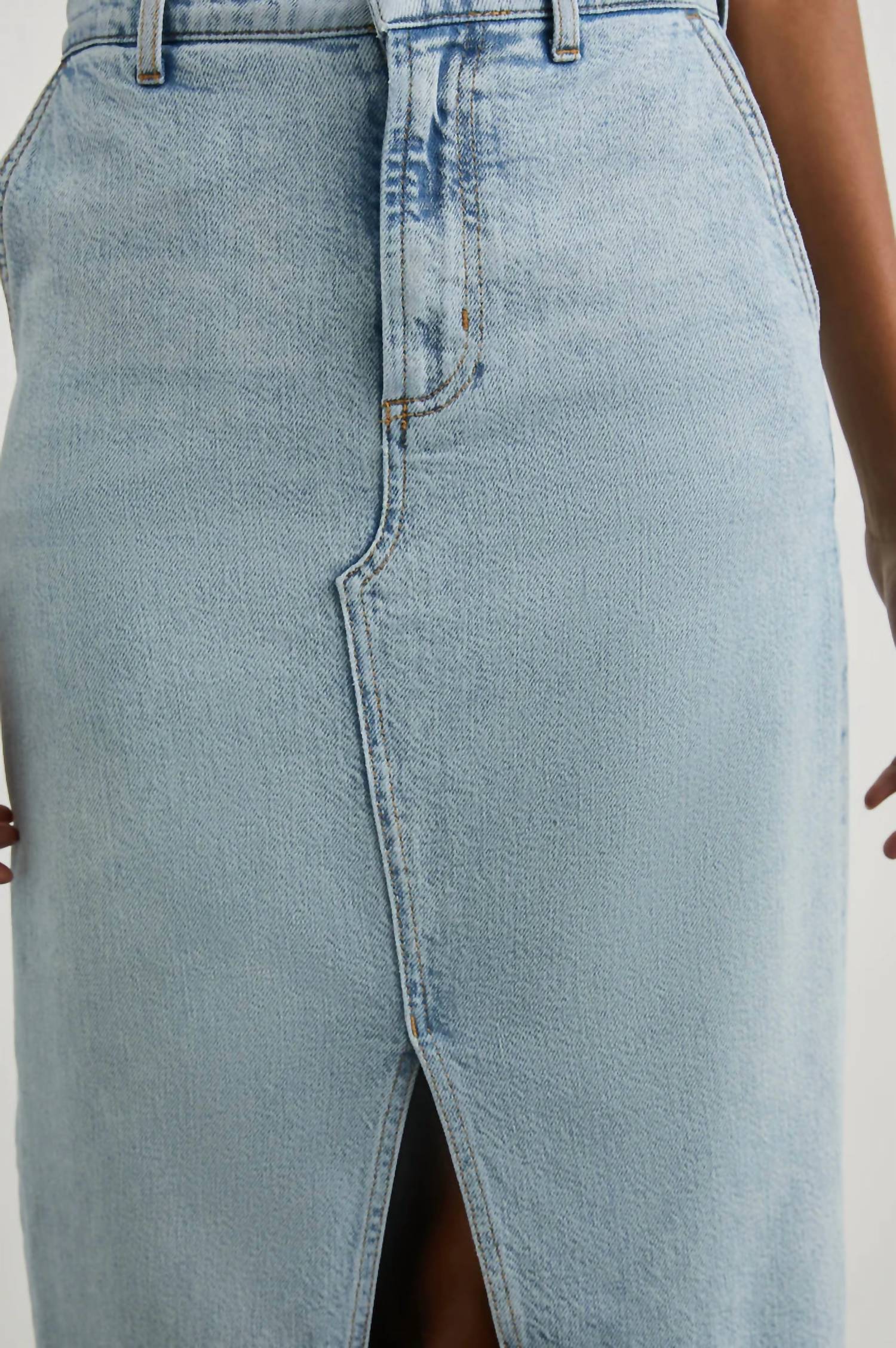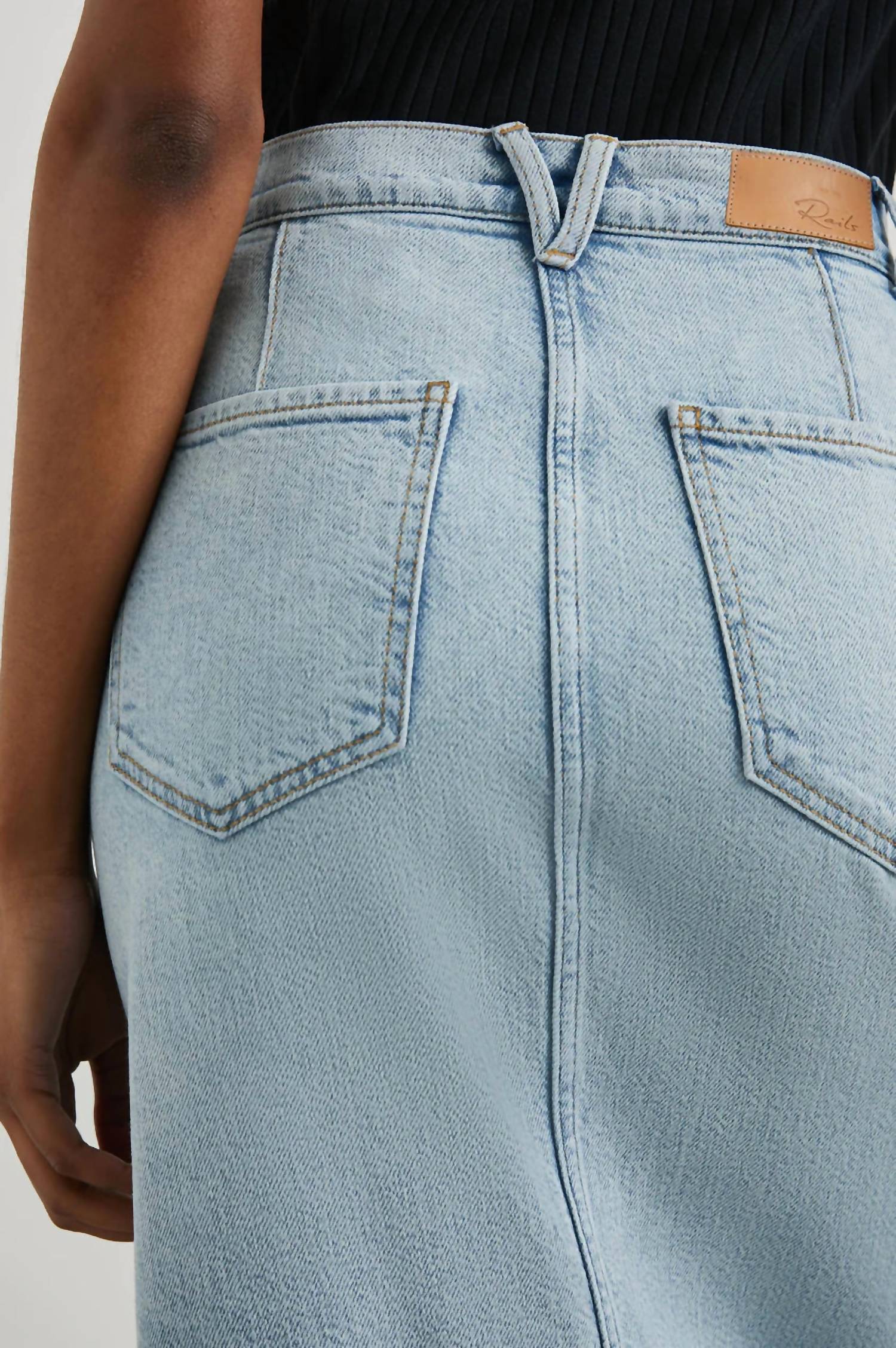 The midi length skirt is here to stay and we especially love this style. Introducing the Manhattan Denim Skirt by Rails, perfect for making a statement with its solid Reef Let Down Hem. This full-length skirt features a zip closure, open front gusset, and novelty pockets in a light sunfaded wash with a vintage released hem, capturing the minimalist trend. Crafted from 80% Cotton and 20% Post Consumer Recycled Cotton, this skirt is both sustainable and stylish. Imported for quality, it's designed for spring dinner parties or any occasion where you want to stand out.
