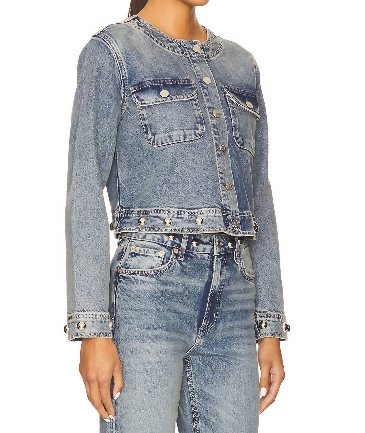 Throw this adorable jacket over just about anything for an effortlessly stylish look. Discover the Rails Capistrano Cropped Jacket in Desert Sky Studded, a standout piece for your fall wardrobe. Designed with long sleeves, this denim jacket combines 59% cotton, 40% lyocell, and 1% elastane for a comfortable stretch and features a boxy fit with a garment length of 16 inches. Its button closure and rounded stud details add modern flair, while the flap pockets provide practicality. This imported piece, originating from Turkey, requires dry clean only care to maintain its pristine condition.