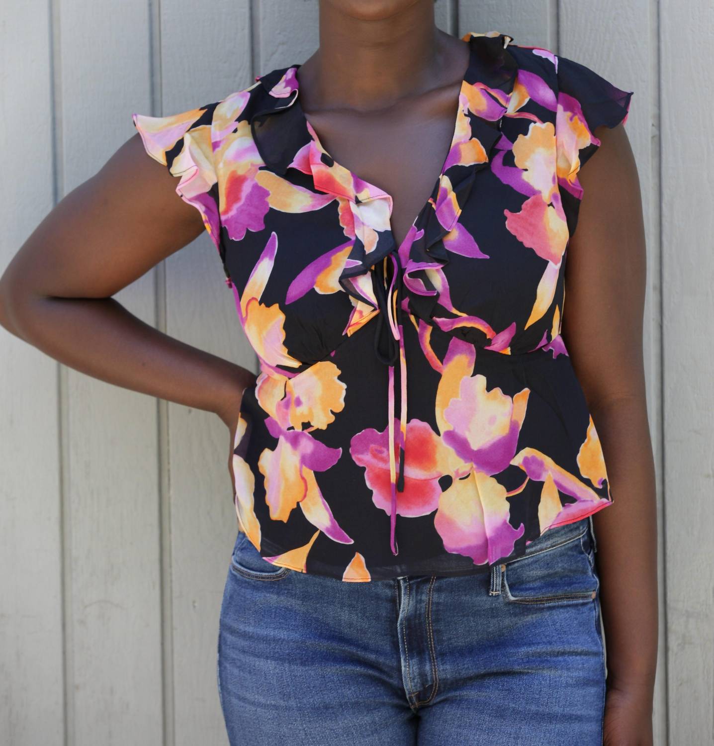 A versatile blouse that works from desk to dinner! Introducing the Carmine Ruffled Top by Rails, a chic blend of elegance and comfort in Dusk Orchid. This chiffon blouse features short flutter sleeves, a ruffled V-neckline with a front tie, and an empire waist silhouette for a fluid fit. Crafted from 100% viscose and imported, it measures a 22" front body length in size S. Designed with a convenient pull-on closure, this top requires dry cleaning for care.