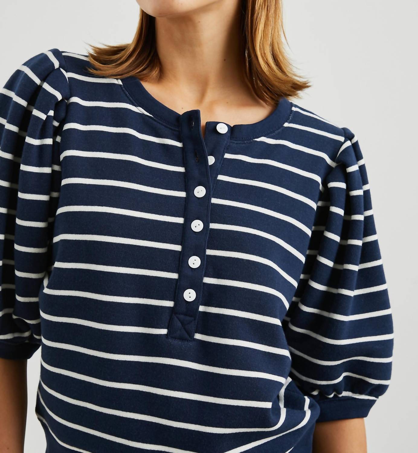 Cozy fabric, impeccable design - Meet the sweatshirt that you'll never want to take off. The Dom Sweatshirt Top by Rails offers a chic update to your go-to sweatshirt with its striped, peplum-sleeved design. Crafted from 100% cotton French Terry, this elbow sleeve top promises comfort and style for everyday wear. Its crewneck and button closure design adds a polished touch, while the imported quality speaks to its craftsmanship. Caring for this 21 1/2" length garment is easy: simply hand wash cold and lay flat to dry.