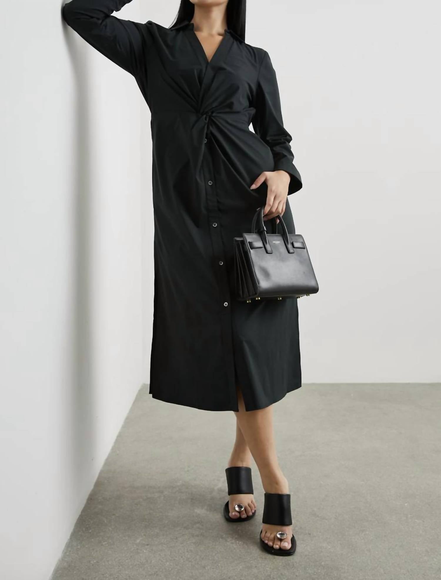 The perfect length dress does exist. Meet the Irie Midi Dress by Rails, a perfect monochrome choice for your vacation wardrobe. This black shirt-dress flaunts a crisp poplin blend of 55% cotton and 45% Tencel, offering a comfortable fit with its long sleeves and collar neckline. The design includes a twist-front bodice, button-front skirt, elasticized back waist, and breezy side slits for added movement. Closure: Button closure. Care: Hand wash cold or dry clean.