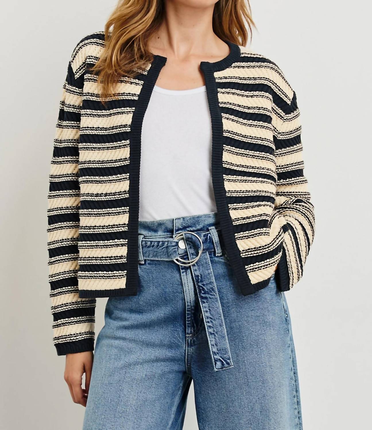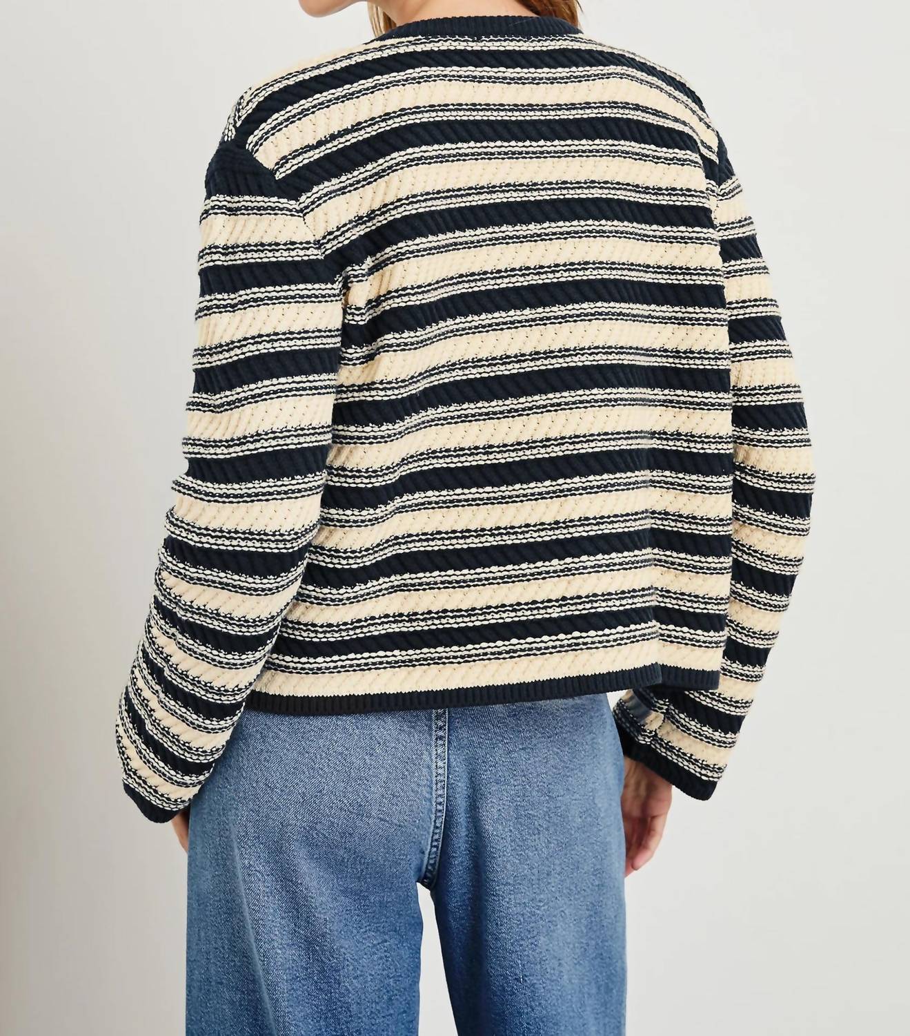 A classic fit that works just as good buttoned as it does left open. Introducing the Nelly Cardigan by Rails, a statement piece in a Navy Oat Stripe design that captures the essence of 90s fashion. With long sleeves and a V-neck, this classic lady jacket silhouette offers a tailored fit for stylish vacation or spring occasions. Crafted from a 60% Cotton, 40% Acrylic blend, it features contrasting textured stripes and refined trim detailing. Closure: Pull on. Care: Dry clean and cool iron if needed, do not bleach. The front body length measures 20 3/4" from size small.