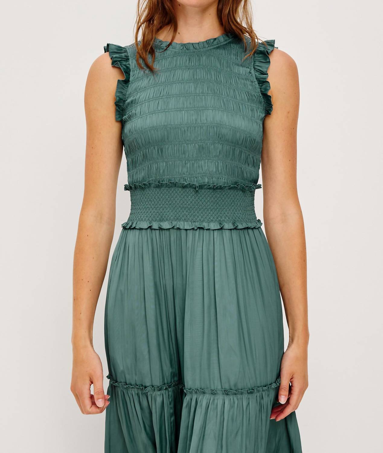 Just add slides or mules and you are good to go. Discover the Vivier Dress by Rails, a graceful maxi dress in a soothing Lake color, crafted from crinkled cotton poplin. This sleeveless design boasts a smocked, fitted bodice with a pull-on closure, leading into an A-line silhouette featuring a relaxed skirt with ruffled tiering. Composition: 100% Cotton. Imported. Care for this elegant piece with a machine wash on a gentle cycle with like colors, tumble dry low, and a cool iron if needed. Front body length is 49", measured from size S.
