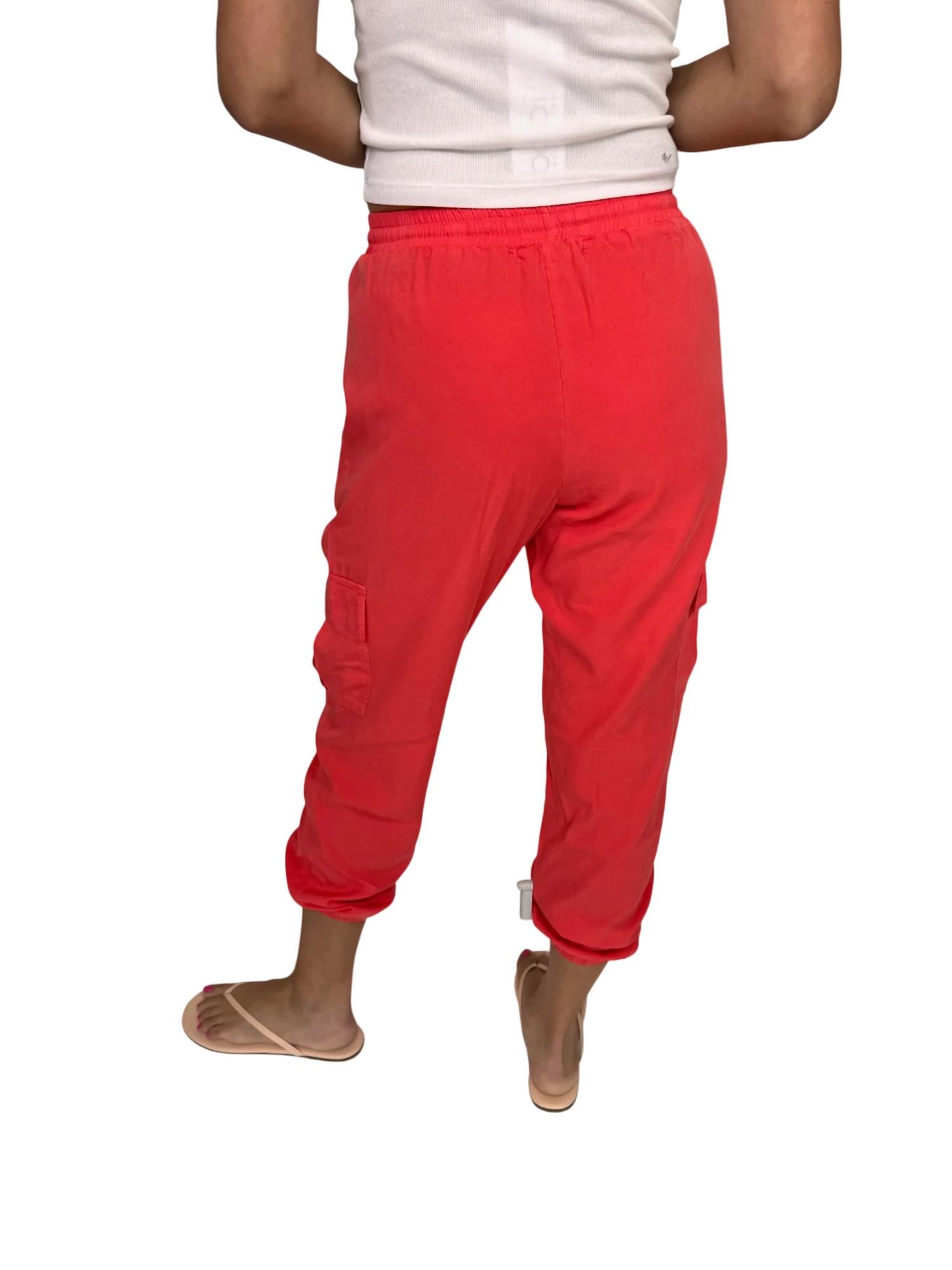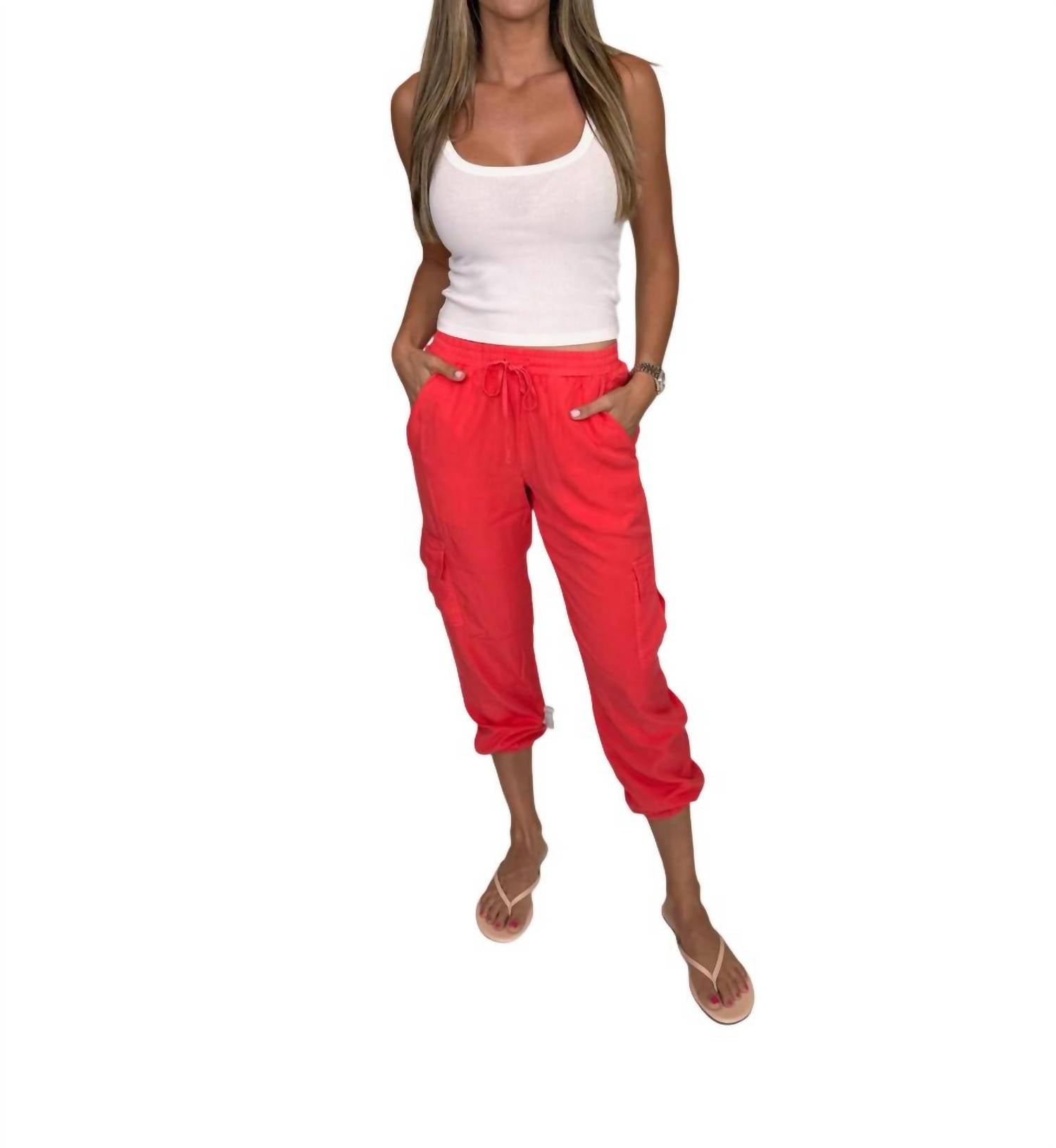 Pair these with your favorite sneakers for an effortlessly cool look. Discover the Harlow Pant by River + Sky, a chic choice in vibrant red designed for both comfort and style. These pants are crafted from 100% Tencel Twill, featuring a pull-on closure for easy wear. Made in the USA, they offer functional cargo pockets and tapered leg style complemented by cuffed ankles. Care instructions include machine wash cold inside out with similar colors, tumble dry low, and light iron inside out. Alyssa, at 5'10", wears a size small.