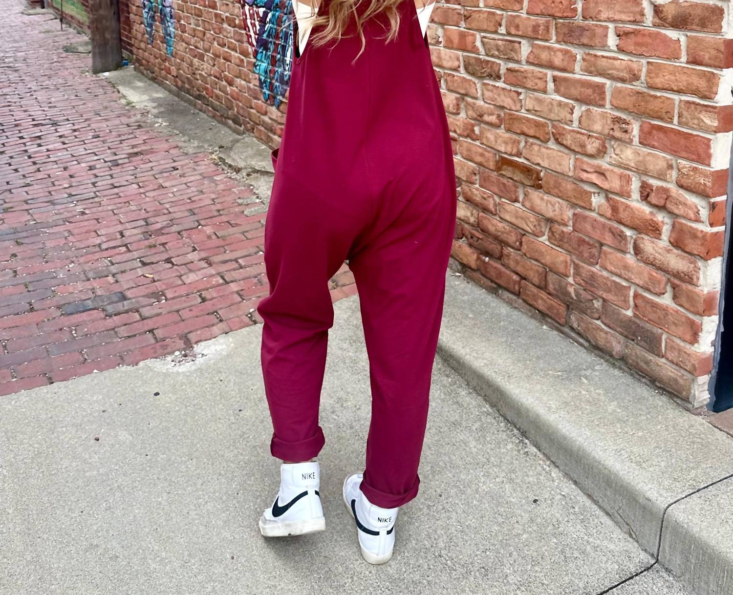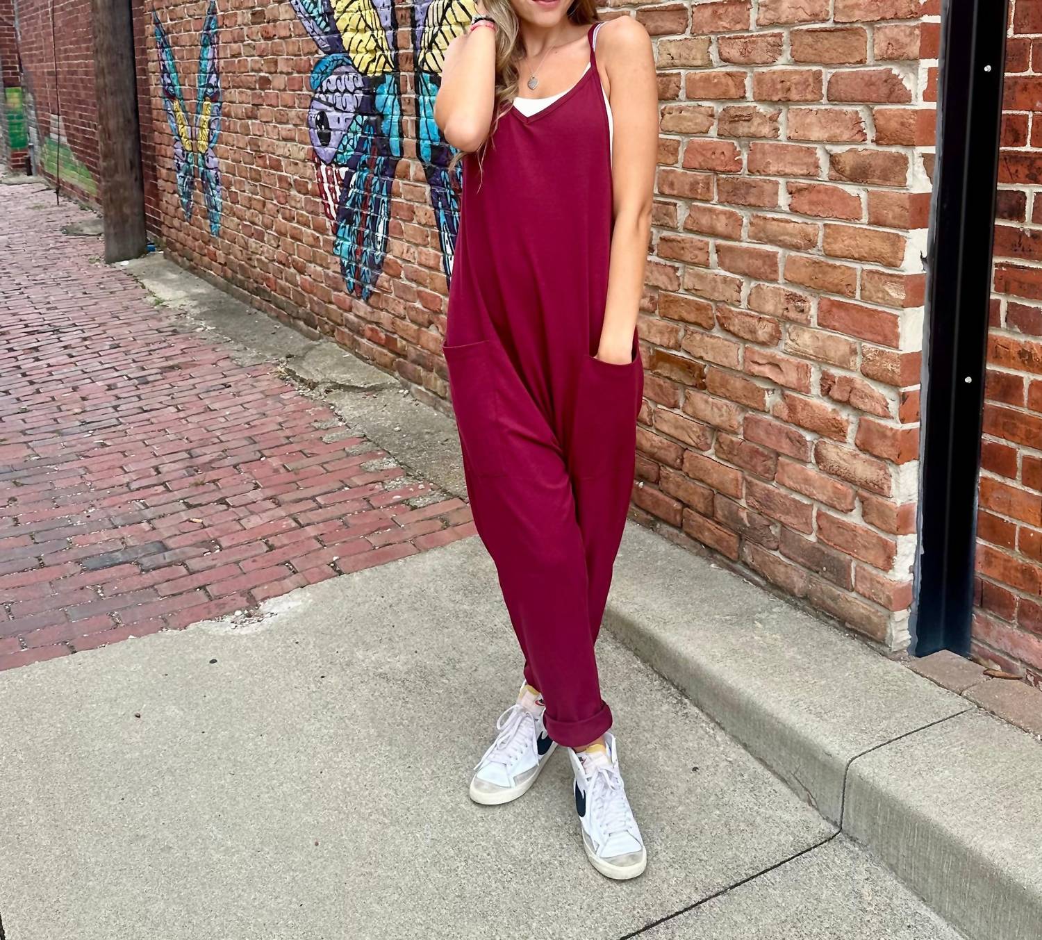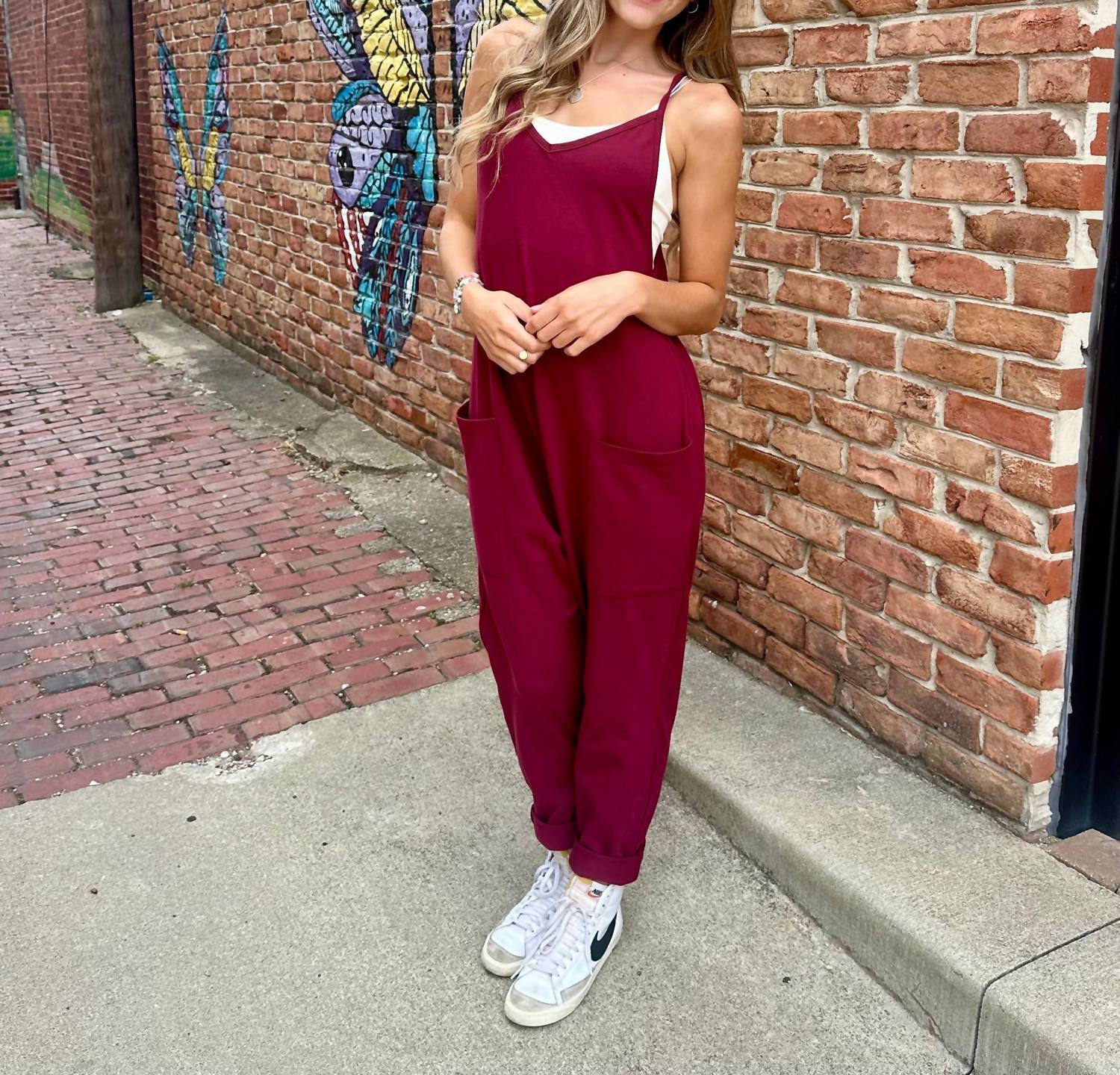 Throw it on and go! Experience ultimate comfort and effortless style with the BUCKETLIST V-Neck Jersey Jumpsuit in Dark Olive. Designed with a soft cotton blend and an oversized, slouchy silhouette, it features dropped armholes and a racerback, accented with oversized patch pockets for convenience. Made in the USA, this jumpsuit is perfect for casual travel occasions, bringing a laid-back charm to your spring wardrobe. Composition: 95% Cotton, 5% Spandex. Care Instructions: Hand wash.