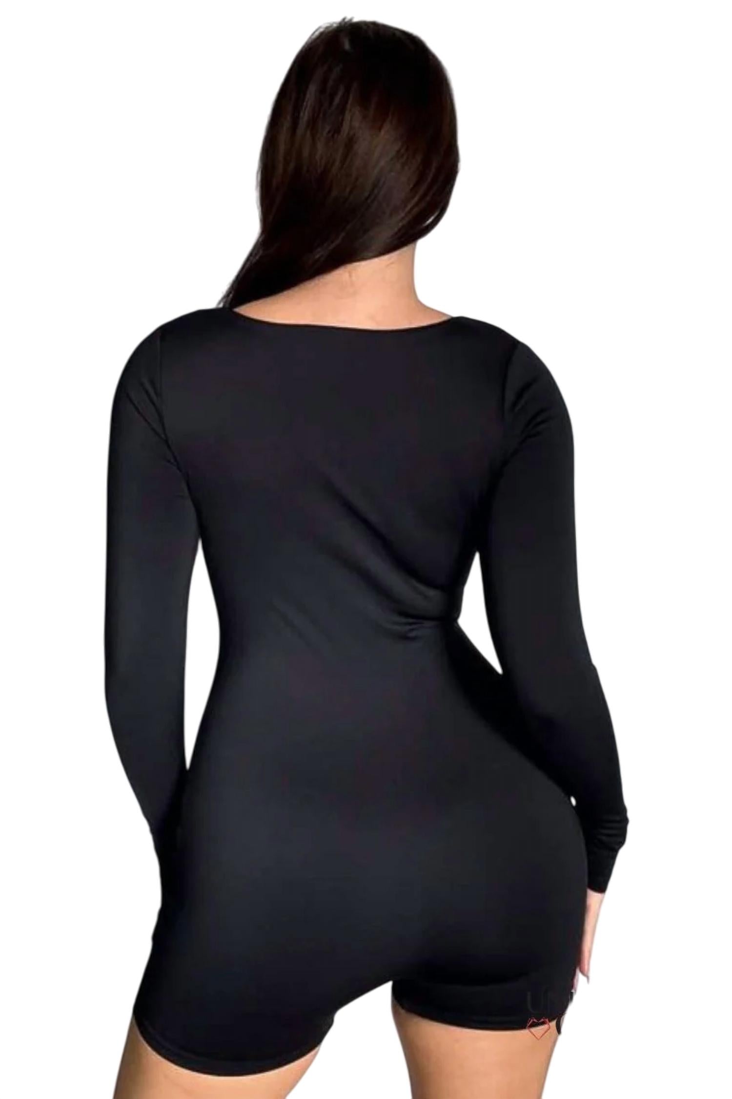 It doesn't take much for this one piece to look effortlessly cool. Add some statement jewelry to dress it up, or throw on some sneakers for a more casual vibe. Introducing the Erin Square Neck Long-Sleeve Romper by SALTY, a versatile piece in sophisticated black designed for active and casual dressing. This stylish romper features long sleeves and a contemporary square neckline, ideal for both work and play. Made from 90% polyester and 10% spandex, the fabric ensures a comfortable, flexible fit with added support from the double lining. Designed with a convenient pull-on closure, it's perfect for on-the-go women seeking effortless chic.