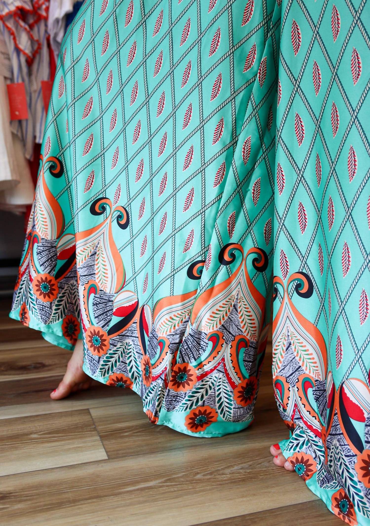 The perfect outfit choice when you you need something quick to throw on and still want to look efforlessly cool. Introducing the Peacock Feather Jumpsuit by Meet Me in Santorini—a striking piece for your spring wardrobe in a vibrant green hue. This women's jumpsuit boasts a maximalist patterned design, showcasing an elegant wide-leg style with a relaxed fit for maximum comfort. Closure: Tie closure. Care: Machine wash. Perfect for vacations and joyful summer occasions like the 4th of July.