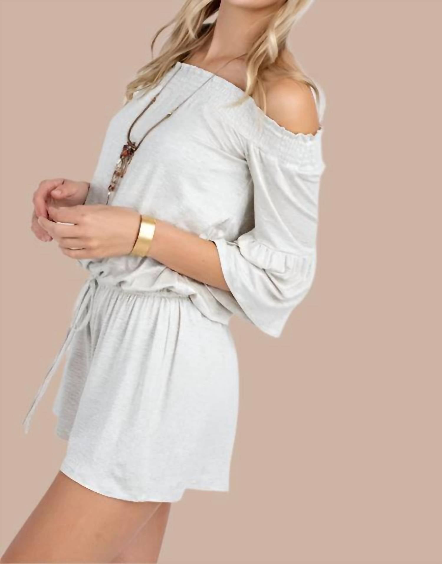 It doesn't take much for this one piece to look effortlessly cool. Add some statement jewelry to dress it up, or throw on some sneakers for a more casual vibe. Introducing the Off Shoulder Romper by 12PM by Mon Ami, a staple for your summer wardrobe in a solid oatmeal hue. This boho chic piece features 3/4 bell sleeves and is crafted from a soft and lightweight jersey fabric with a composition of 95% Rayon and 5% Spandex. It offers a comfortable elastic waist for a loose fit and a pull-on closure for convenience. Proudly made in the USA, care instructions recommend hand washing to maintain the texture and color.