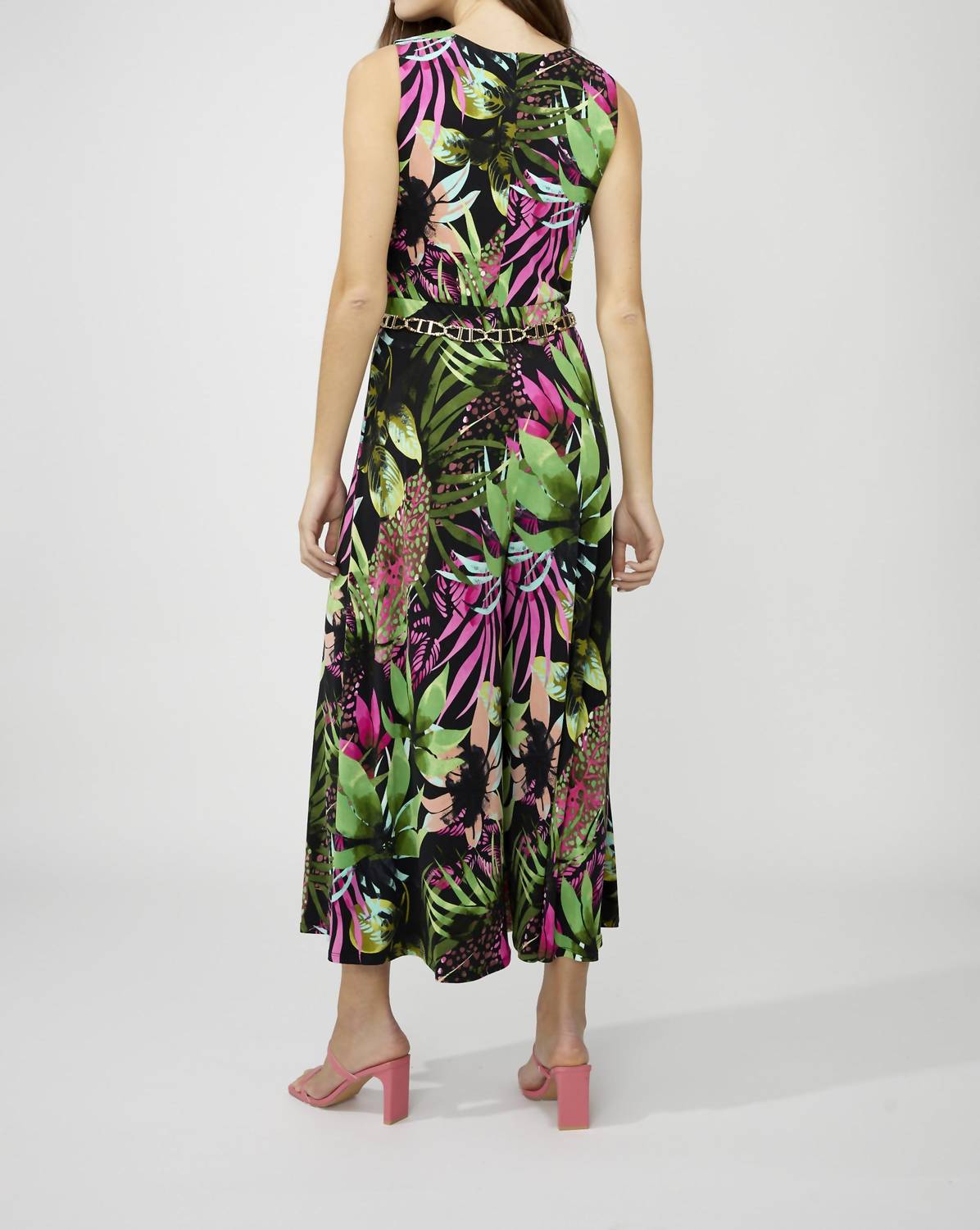 The perfect outfit choice when you you need something quick to throw on and still want to look efforlessly cool. Elevate your summer wardrobe with the Floral Sleeveless Jumpsuit by Frank Lyman, a chic choice in vibrant Green/Fuchsia. This full-length piece highlights both comfort and style with its wide leg design and a belted waist, accentuating a feminine floral pattern. Composed of 95% Polyester and 5% Elastane, it features a back zip closure for easy wear. Care: Hand wash and lay flat to dry. The model, standing at 5'9", wears a size 6; approximate length for size 12 is 48 inches.