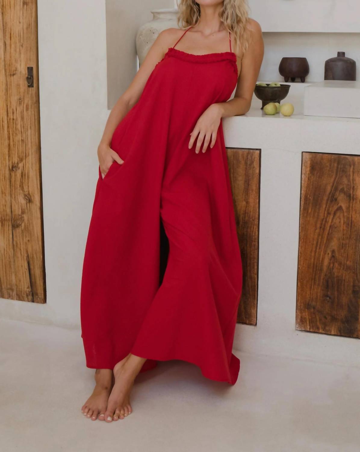 It doesn't take much for this one piece to look effortlessly cool. Add some statement jewelry to dress it up, or throw on some sneakers for a more casual vibe. Elevate your style with the Halter Gathered Scoop Neck Jumpsuit by Erica Wilson, a striking piece in Love Red that exudes boho chic charm. This ankle-length jumpsuit features an adjustable halter with a drawstring tie at the neckline and pockets for added convenience. Crafted from 100% Cotton Dobby, it offers a relaxed fit with single-tier wide-leg pants, perfect for vacation or spring outings. Slip on this piece effortlessly and keep it fresh by professional dry cleaning or hand washing cold, and line drying. Ideal for seamlessly transitioning from day to night.