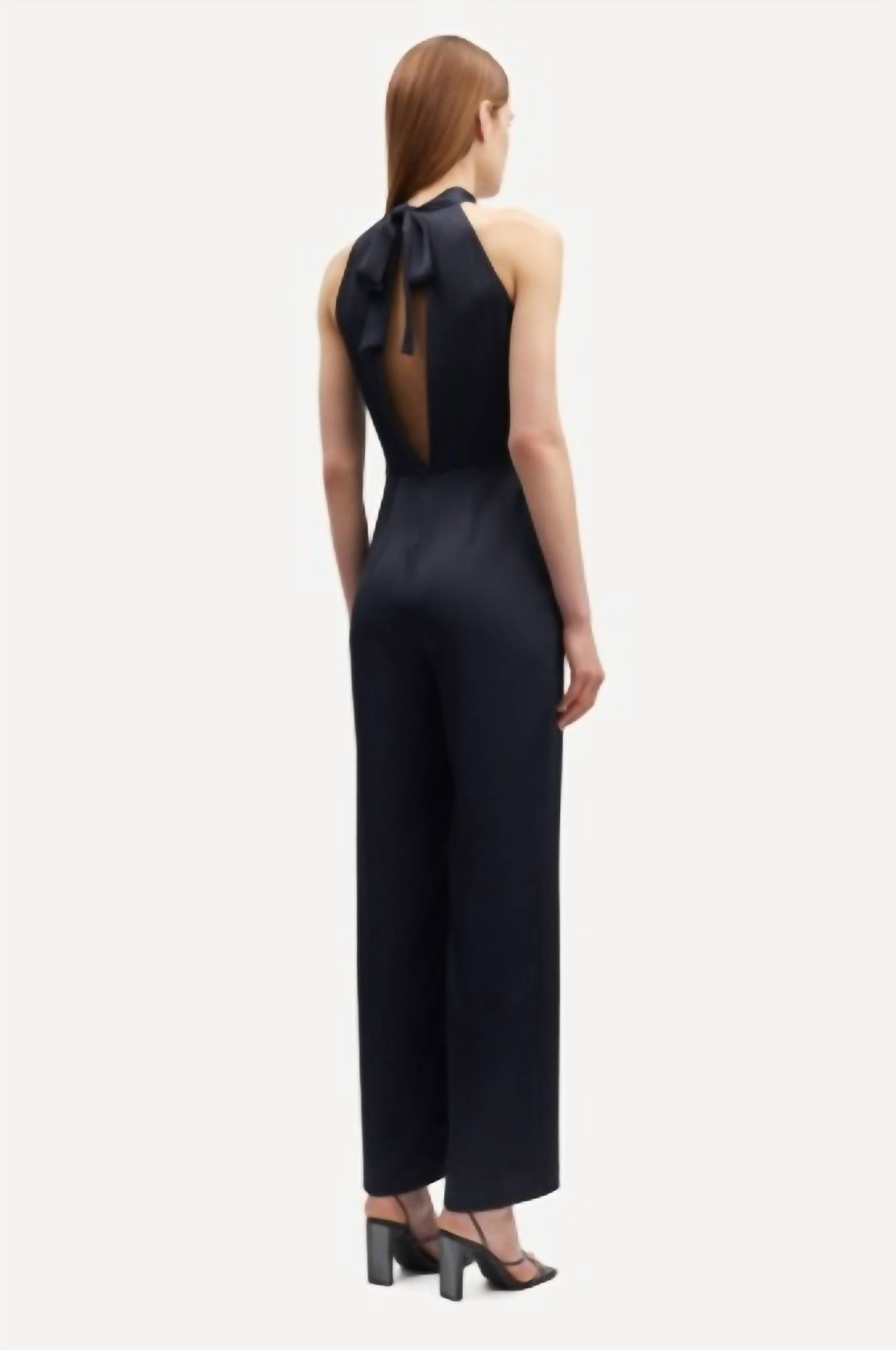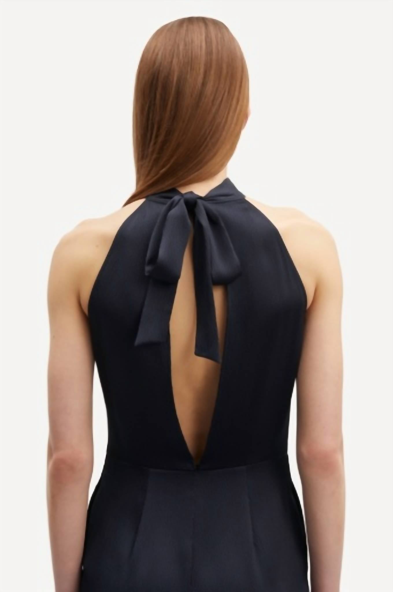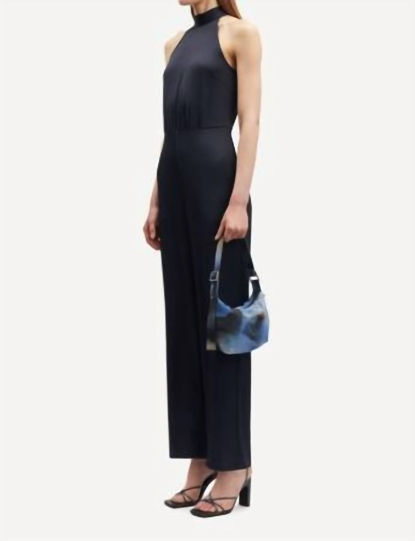 It doesn't take much for this one piece to look effortlessly cool. Add some statement jewelry to dress it up, or throw on some sneakers for a more casual vibe. Discover the Sarheo Jumpsuit by SAMSOE in a chic Salute color, perfect for your Spring holiday party. This slim fit jumpsuit features a crew neck, side zip closure, and back tie straps, offering a satin finish for a luxurious look. It has a sustainable composition of 51% Recycled Polyester, 47% Polyester, and 2% Elastane. Made in China, it provides practicality with slit side pockets and straight legs, embodying the quiet luxury trend.
