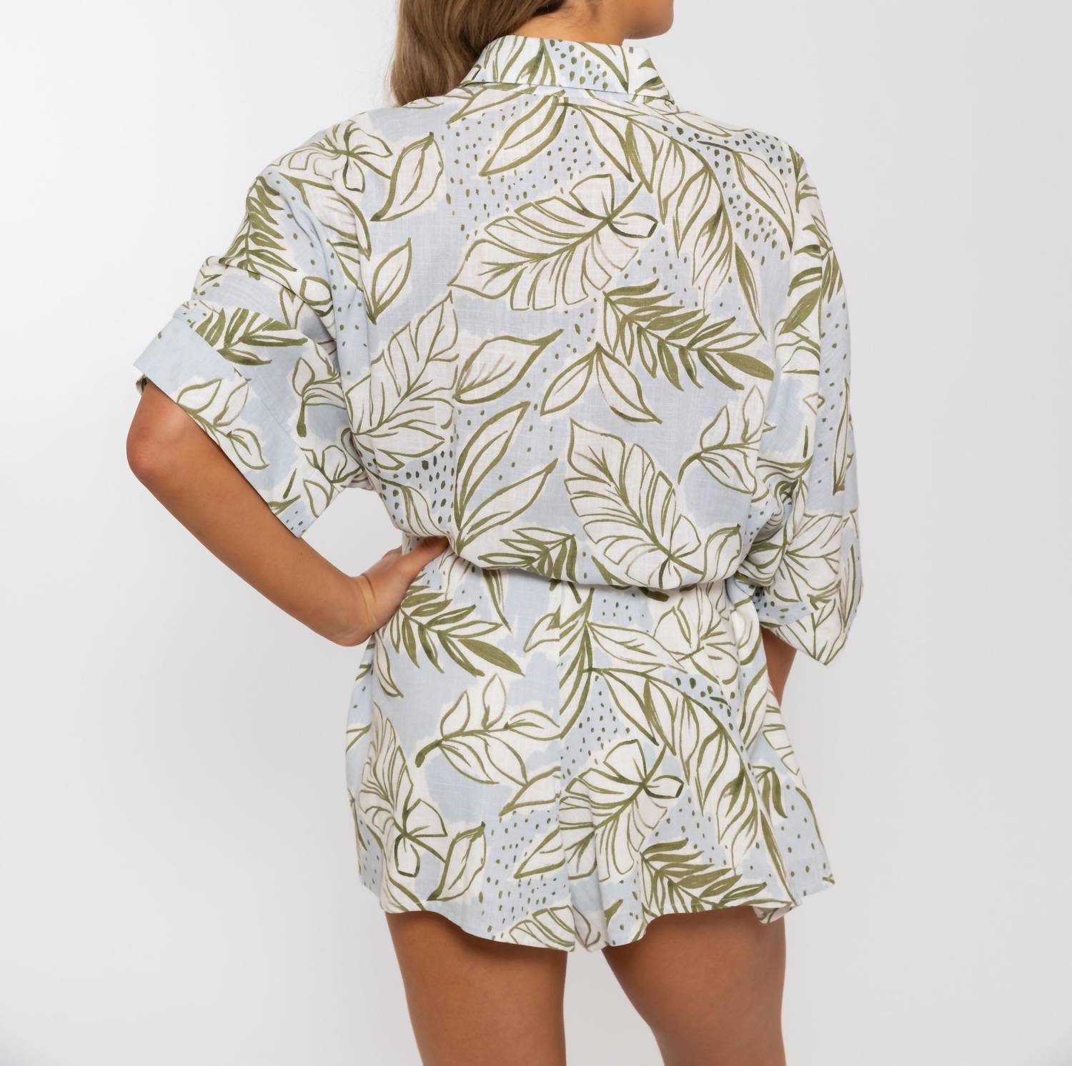 Experience ultimate comfort and style with the Linen Button Romper by Karlie, perfect for soaking up summer vibes. Designed with a fun tropical print, this romper is crafted from breathable polyester and features a pull-on closure for easy wear. Its lightweight linen-like feel ensures you stay cool and relaxed, making it an ideal choice for beach days. With convenient pockets, this romper combines functionality with a confident, eye-catching flair. Model is 5'5" and is wearing a size small.
